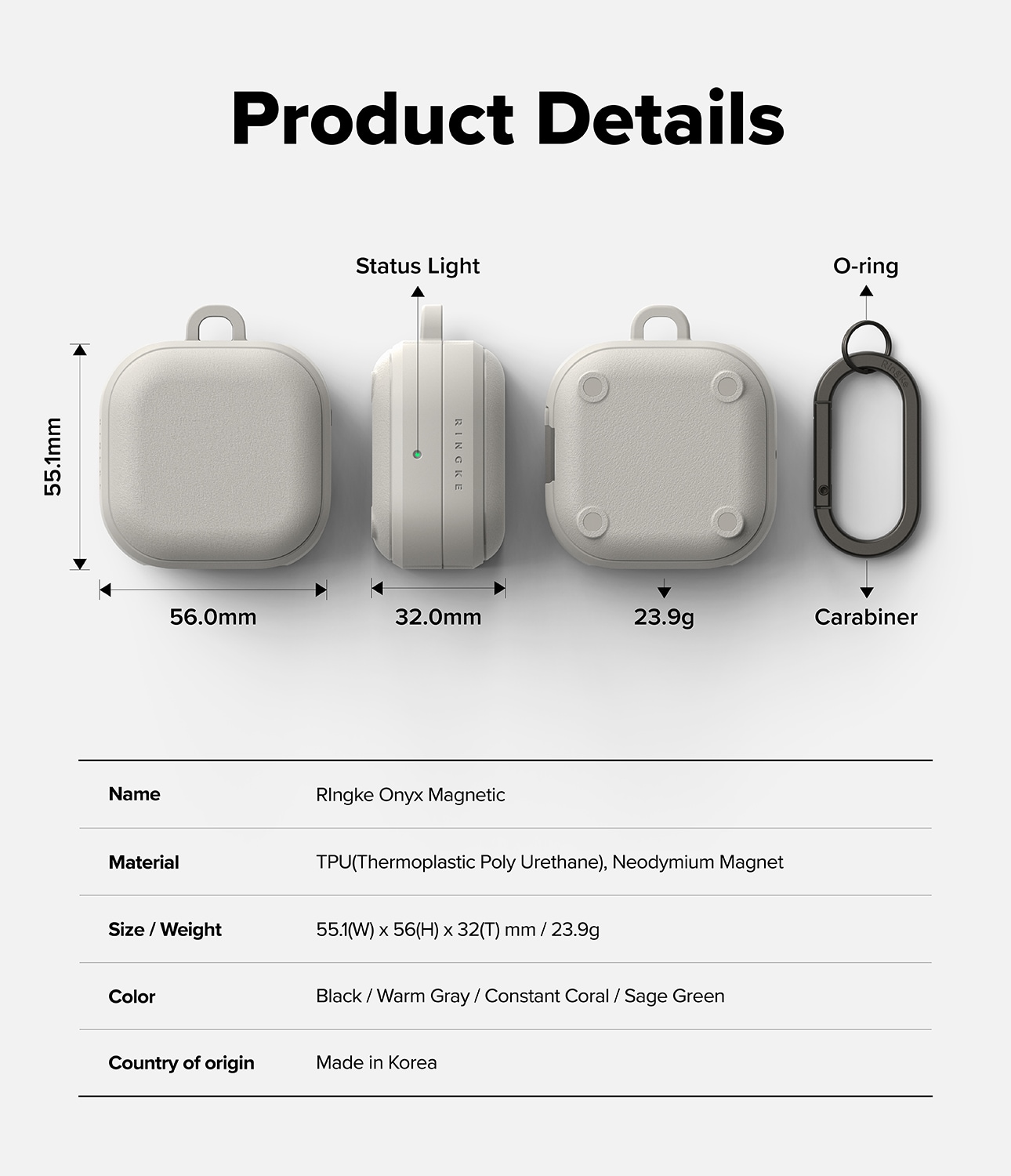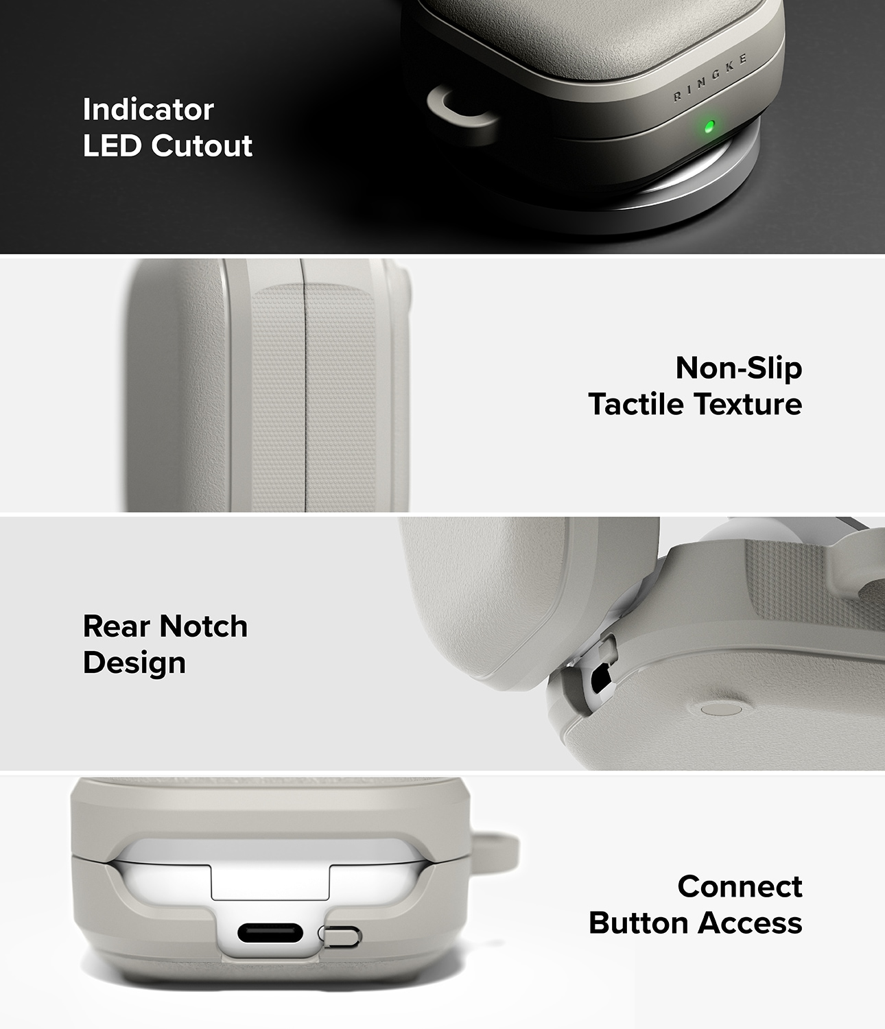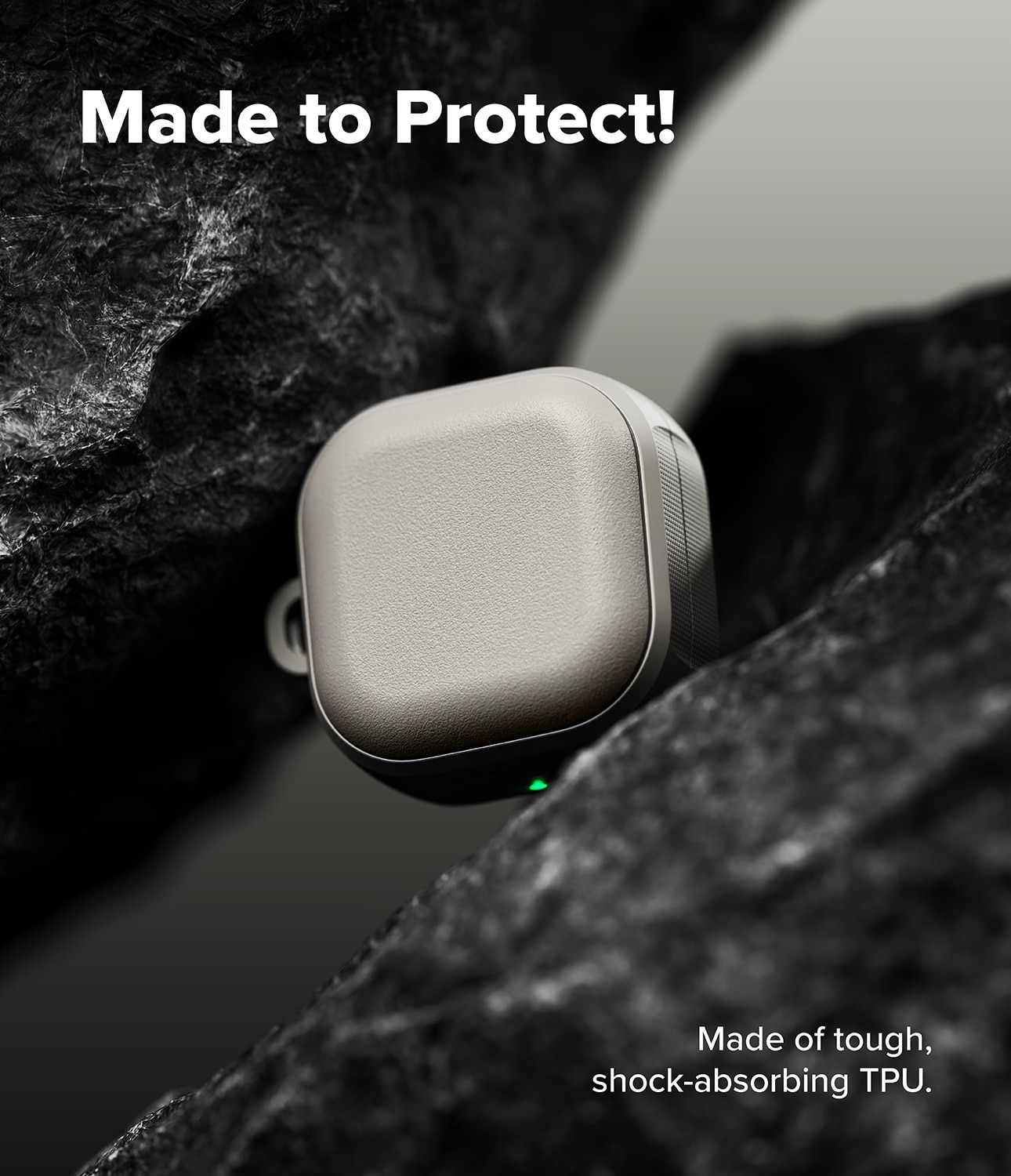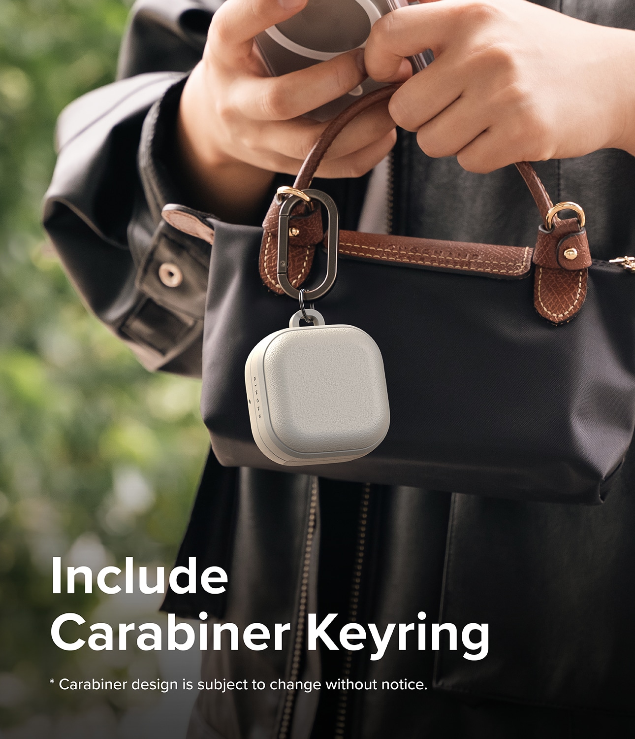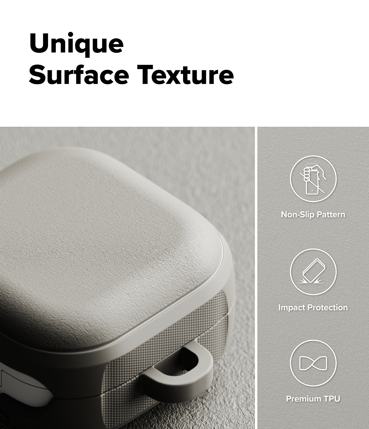 Robuste Hülle mit MagSafe und Karabiner für Samsung Galaxy Buds 4 von Ringke. Die Hülle bietet ein stilvolles Design und hervorragenden Schutz vor Stößen. Sie besteht aus flexiblem und langlebigem TPU mit einer einzigartigen matten, granulierten Textur, die sich angenehm anfühlt und Rutschgefahr sowie Fingerabdrücke verhindert.