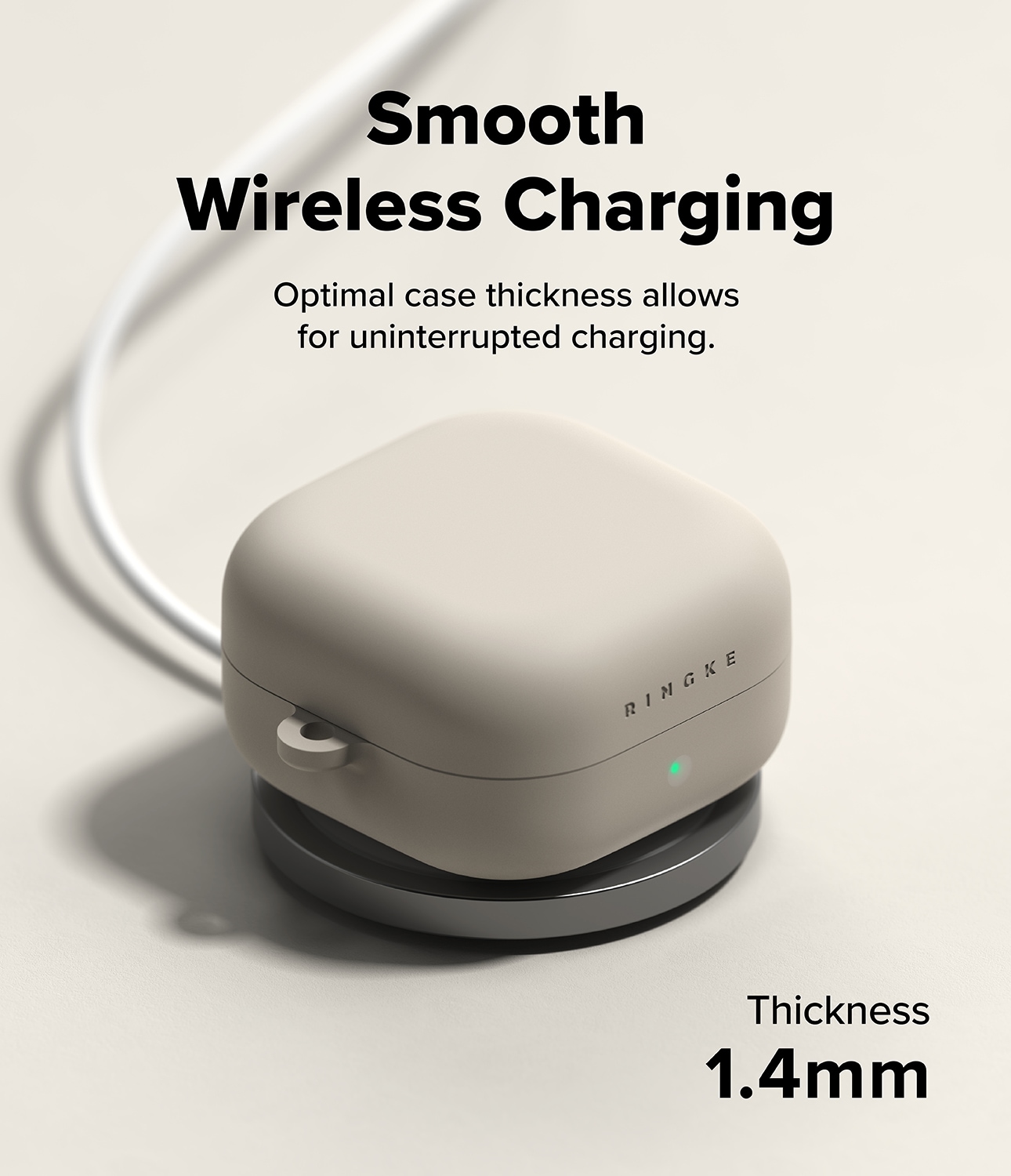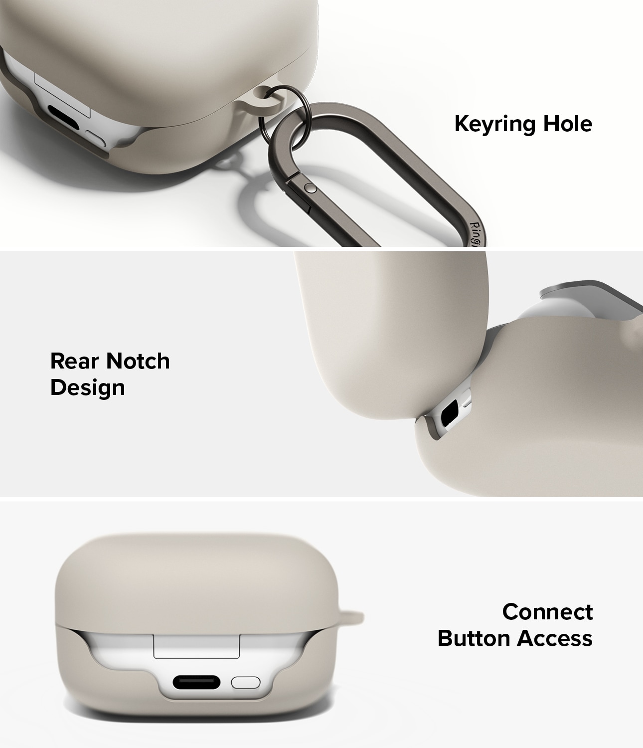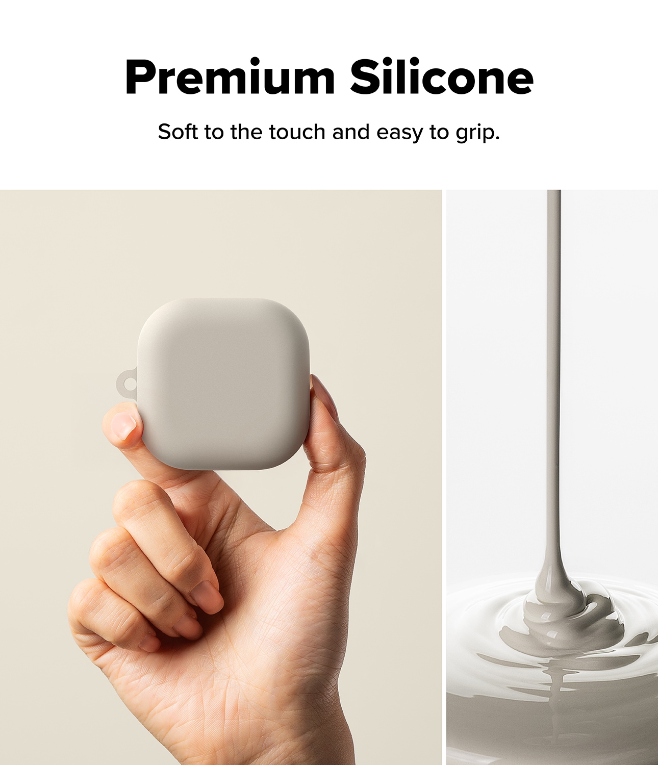 Stilvolles Silikon-Case mit Karabiner für Samsung Galaxy Buds 4 Pro von Ringke. Das Case hat ein schlankes Design, ist jedoch stoßdämpfend und schützt so vor Schäden. Es besteht aus hochwertigem Flüssigsilikon mit einer Oberfläche, die sich luxuriös anfühlt und gleichzeitig hervorragenden Schutz bietet. Das Case verfügt über ein zweischichtiges Design mit einem starken Polycarbonat-Rahmen im Inneren und Silikon außen.