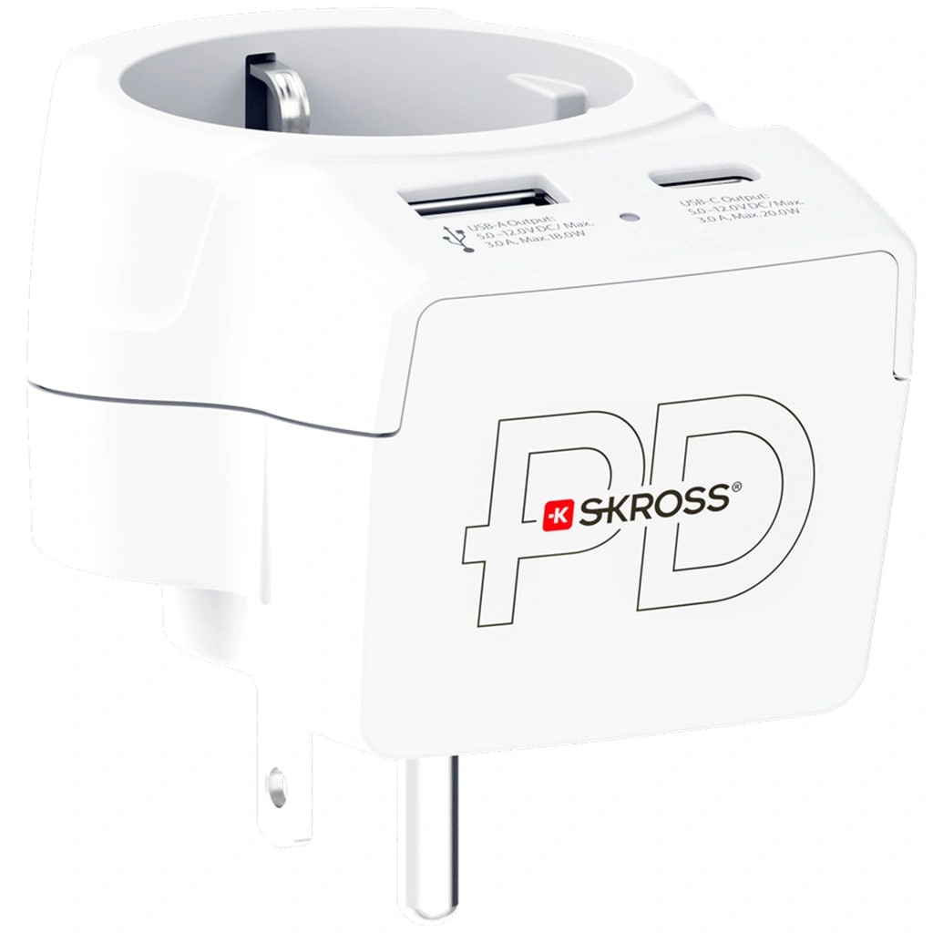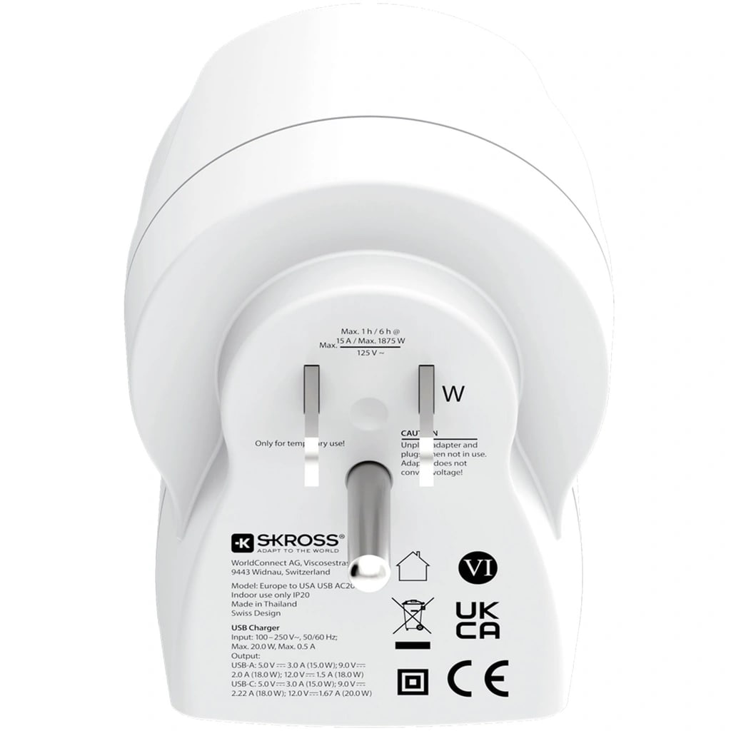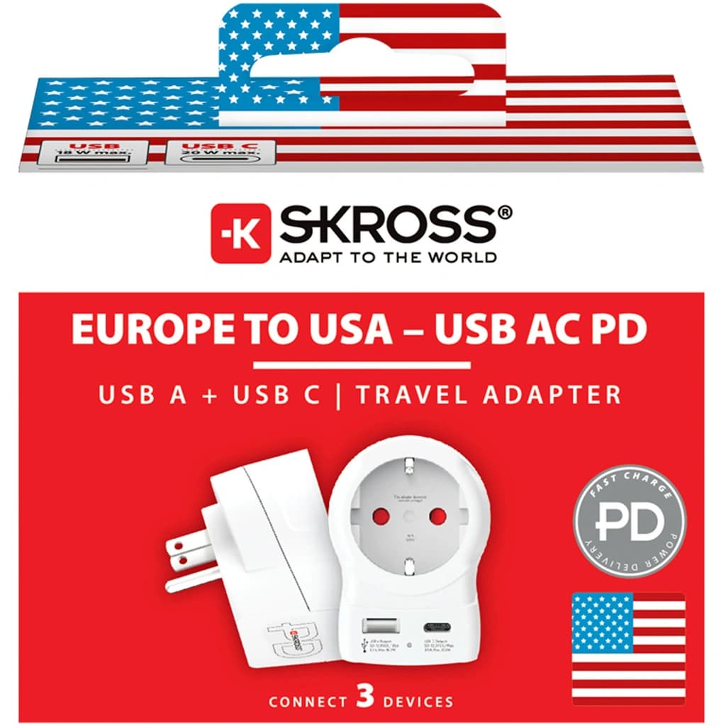 62414Europe to USA USB AC PD 20Whttps://www.phonelife.de/ladegerate-kabel/reiseadapter/europe-to-usa-usb-ac-pd-20w?channelCountry=DEhttps://www.phonelife.de/pub_images/original/A15506_1.pngInStock22.95EUR/ladegerate-kabel/reiseadapterSKROSS<p>SKROSS Europe to USA USB AC PD 20W ist ein praktischer Reiseadapter mit integriertem USB-Ladegerät, der die Nutzung europäischer Geräte in amerikanischen Steckdosen ermöglicht. Er ist kompatibel mit geerdeten und ungeerdeten Steckern und unterstützt eine Belastung von bis zu 15 A, wodurch er auch für leistungsstärkere Geräte wie Laptops und Haartrockner geeignet ist. Mit integrierten USB-A und USB-C Anschlüssen können zwei Geräte gleichzeitig effizient und stabil mit bis zu 20 W pro Anschluss geladen werden. Die energieeffiziente Konstruktion sorgt für einen niedrigen Stromverbrauch im Leerlauf und zuverlässige Leistung im Alltag. Eine kompakte Lösung für Reisen in die USA und andere Länder mit gleichem Standard.</p>