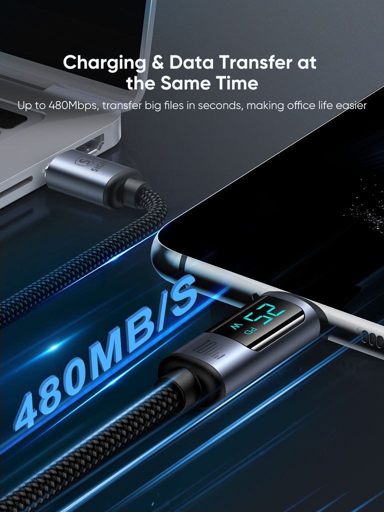 Das integrierte Display zeigt die Ladeleistung in Echtzeit an und ermöglicht volle Kontrolle. Das Kabel unterstützt Datenübertragung bis zu 480 Mbps und ermöglicht die einfache Synchronisierung von Dateien, Bildern und Vid... Weiterlesen