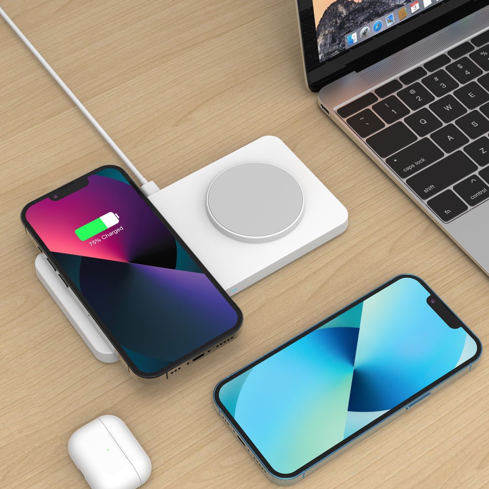 Laden Sie zwei Geräte gleichzeitig mit diesem kabellosen 2-in-1-Ladepad. Das schlanke Design eignet sich perfekt für Ihren Schreibtisch oder Nachttisch und hilft Ihnen, Kabelsalat zu vermeiden. Mit einer Gesamtleistung von 30W erhalten Sie schnelles und effizientes Laden: bis zu 15W pro Ladefläche für Smartphones und bis zu 5W für kabellose Ohrhörer.