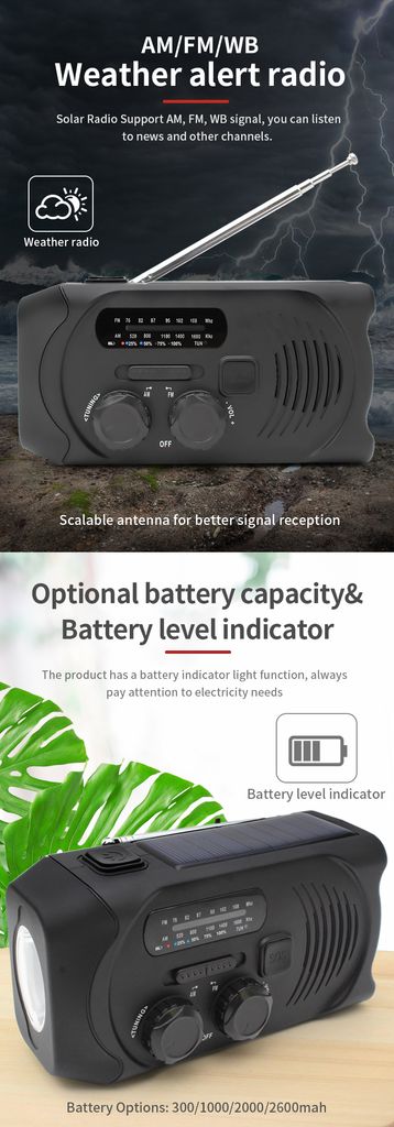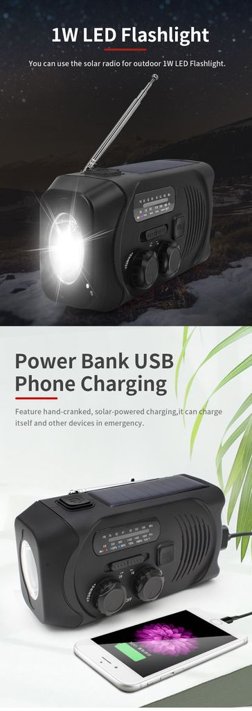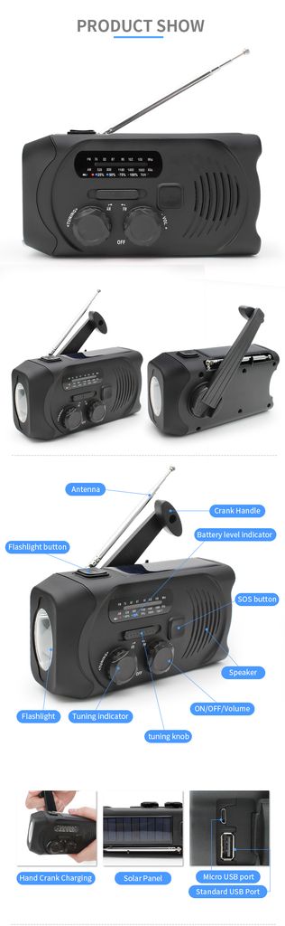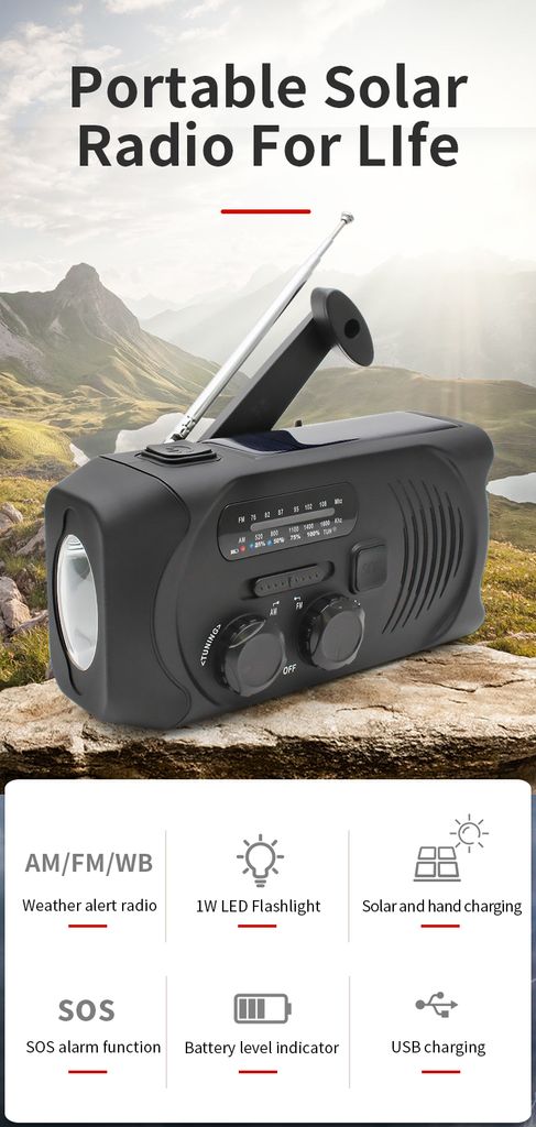 - Typ: Dynamo-Radio / Kurbelradio mit Solarzellen, Taschenlampe und Notladegerät<br />