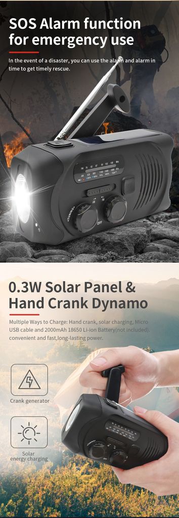 - Laden per Kurbel, Solarpanel oder USB<br />