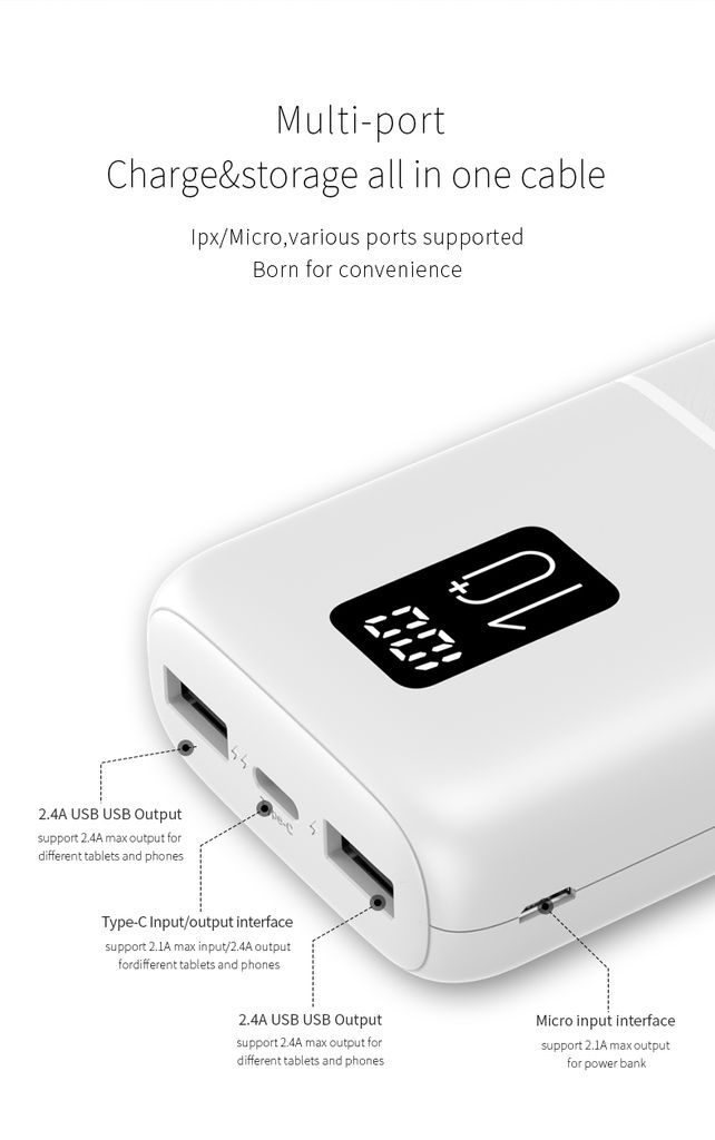Das LED-Display zeigt den Batteriestand deutlich an. Die Powerbank verfügt über zwei USB-A-Anschlüsse und einen USB-C-Anschluss sowie USB-C und Micro-USB Eingänge. Sie unterstützt Schnellladen.