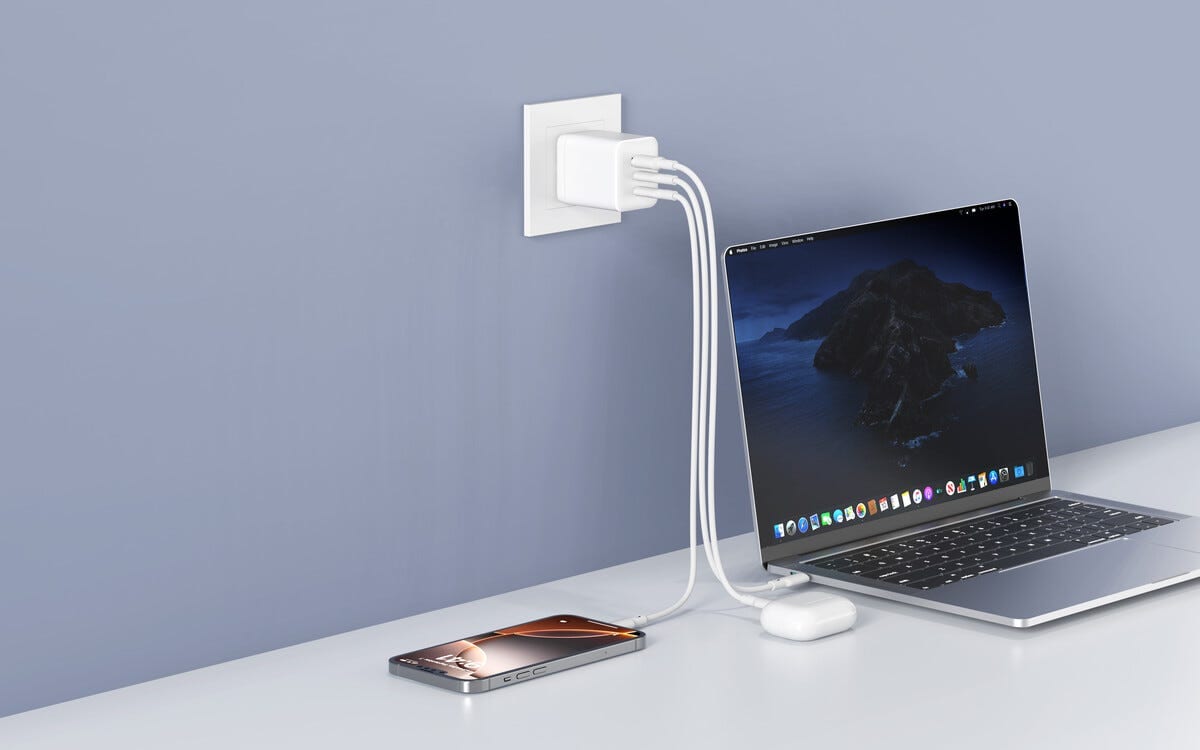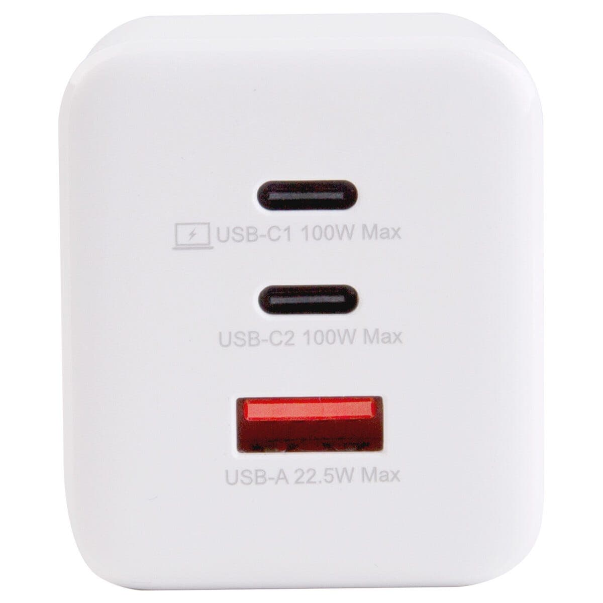 <p>Das Ladegerät verfügt über zwei USB-C-Anschlüsse und einen USB-A-Anschluss sodass bis zu drei Geräte gleichzeitig geladen werden können. Der USB-A-Anschluss unterstützt Quick Charge bis zu 22,5 W und das Ladegerät verteilt die Leistung automatisch je nach Anzahl der angeschlossenen Geräte. Das praktische Design macht es einfach das Ladegerät als vollständige Ladelösung mitzunehmen.</p>