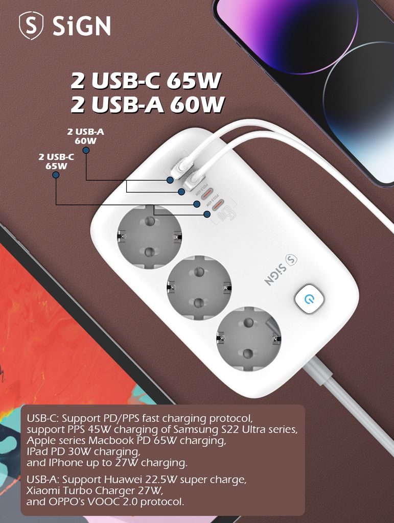 621423-vejs stikdåse GaN 65W med 2 x USB-C + 2 x USB-A 2 m Weißhttps://www.phonelife.de/ladegerate-kabel/zubehor-ladegerate-kabel/3-vejs-stikdase-gan-65w-med-2-x-usb-c-2-x-usb-a-2-m-wei?channelCountry=DEhttps://www.phonelife.de/pub_images/original/0_-_-_5_-_-_SE3436_E6_BF_80_E5_85_89_E6_95_88_E6_9E_9C_E5_9B_BE_20_283_29_281_29_xNWYzAuoEbv1xko3G4pCe.jpgInStock30.95EUR/ladegerate-kabel/zubehor-ladegerate-kabelSiGN<p>Kompakte und leistungsstarke GaN-Steckdosenleiste von SiGN, die schnelles Laden mit einem intelligenten Design für Zuhause, Büro oder Reisen kombiniert. Mit drei Steckdosen sowie zwei USB-A- und zwei USB-C-Anschlüssen können mehrere Geräte gleichzeitig einfach und effizient geladen werden. Die GaN-Technologie ermöglicht eine hohe Leistung bei geringerer Wärmeentwicklung und sorgt für eine stabile und sichere Energieversorgung auch bei höherer Belastung. Eine Gesamtleistung von bis zu 65 W macht diese Steckdosenleiste ideal für Laptops, Tablets, Smartphones und andere elektronische Geräte. Das praktische 2-Meter-Kabel bietet flexible Platzierungsmöglichkeiten und hilft dabei, eine organisierte und moderne Ladestation im Alltag zu schaffen. Eine stilvolle und platzsparende Lösung für heutige Anforderungen an schnelles und sicheres Laden.</p>