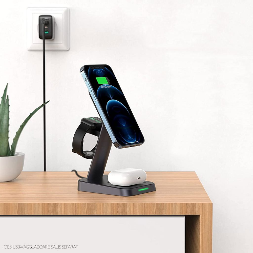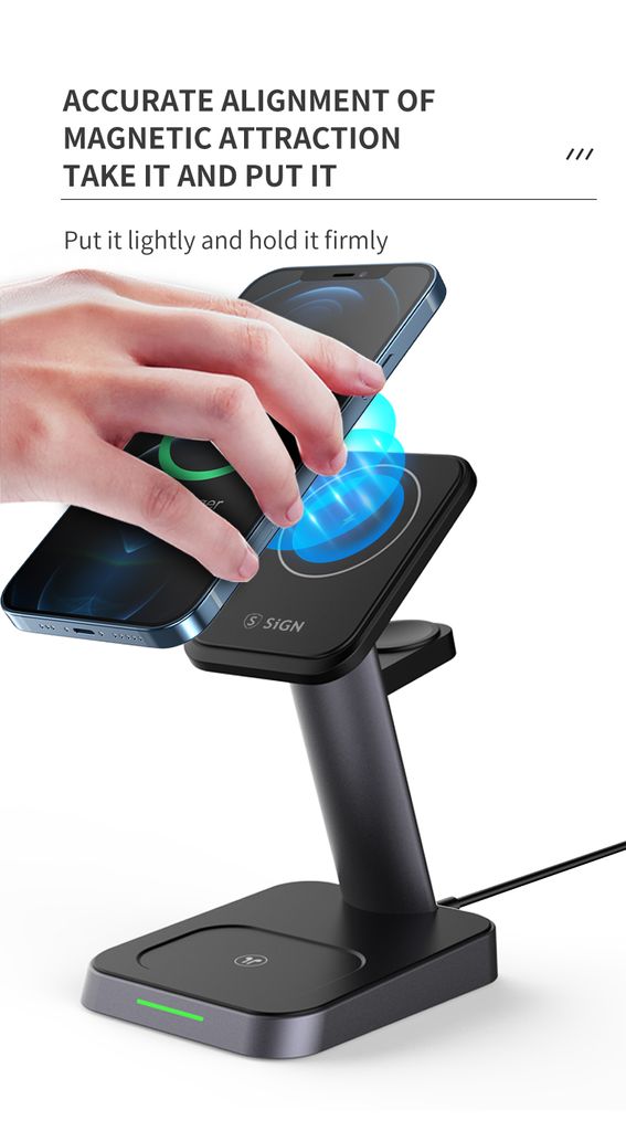 Die 3-in-1 kabellose MagSafe Ladestation 15W von SiGN ist eine praktische und platzsparende Lösung zum gleichzeitigen Laden von Smartphone, Apple Watch und AirPods. Das magnetische MagSafe-kompatible Design sorgt für stabile und sichere Ladeverbindung und einfache Positionierung.