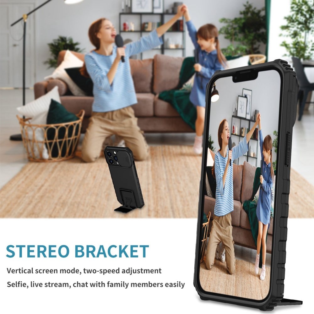 Handyhülle mit Kameraabdeckung und Stativ für Apple iPhone 13 Pro. Die Hülle verfügt über eine zweilagige Konstruktion mit einem flexiblen TPU-Rahmen und einer äußeren Schale aus Hartplastik. Die Kanten sind verstärkt, um Stöße und Stürze effektiv abzufedern.