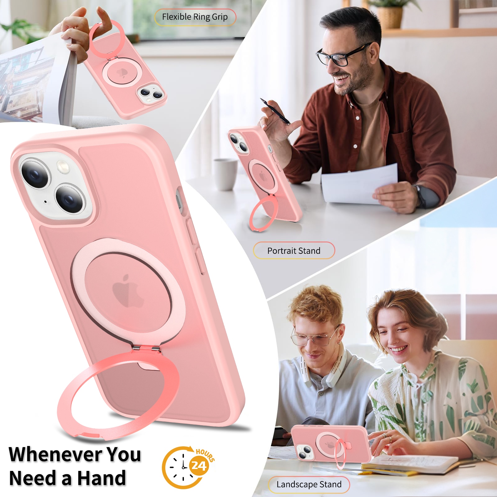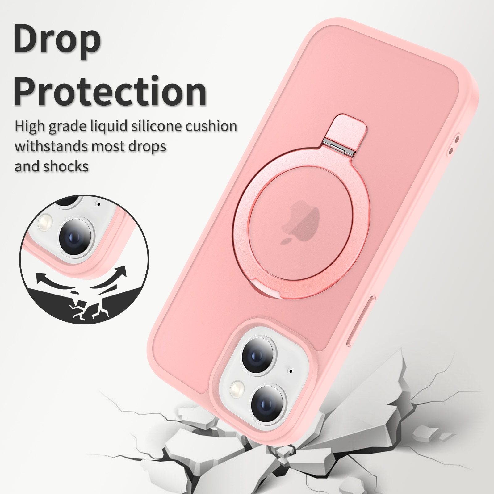 MagSafe Schutzhülle Hybrid für Apple iPhone 13. Für optimalen Schutz vor Stößen und Stürzen verfügt die Hülle über ein zweiteiliges Design mit einem TPU-Kern und einer Außenschale aus Hartplastik. Der Ring auf der Rückseite ist magnetisch und kompatibel mit MagSafe-Zubehör wie Ladegeräten und Kartenhaltern. Er kann außerdem als Ständer zum Ansehen von Filmen, Videos oder zum Spielen verwendet werden.