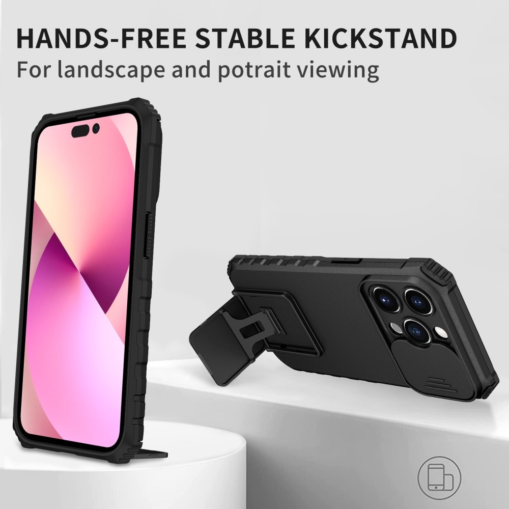 Handyhülle mit Kameraabdeckung und Stativ für Apple iPhone 15 Pro. Die Hülle verfügt über eine zweilagige Konstruktion mit einem flexiblen TPU-Rahmen und einer äußeren Schale aus Hartplastik. Die Kanten sind verstärkt, um Stöße und Stürze effektiv abzufedern.