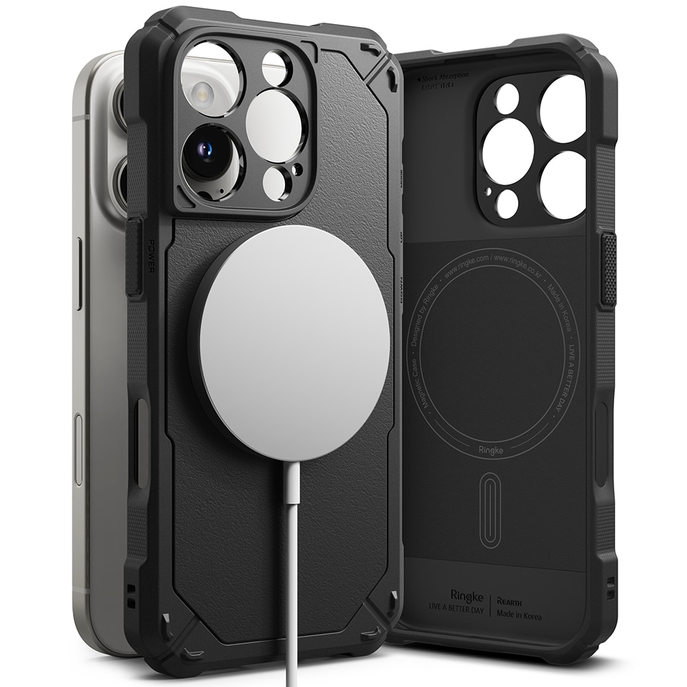 Robustes Case mit MagSafe für Apple iPhone 16 Pro von Ringke, entworfen, um Ihrem Telefon maximalen Schutz vor Stößen und Stürzen zu bieten. Das stoßdämpfende Case schützt effektiv vor Schäden, während die MagSafe-Funktion es Ihnen ermöglicht, MagSafe-Zubehör zu verwenden und kabellos zu laden, ohne das Case abzunehmen.
