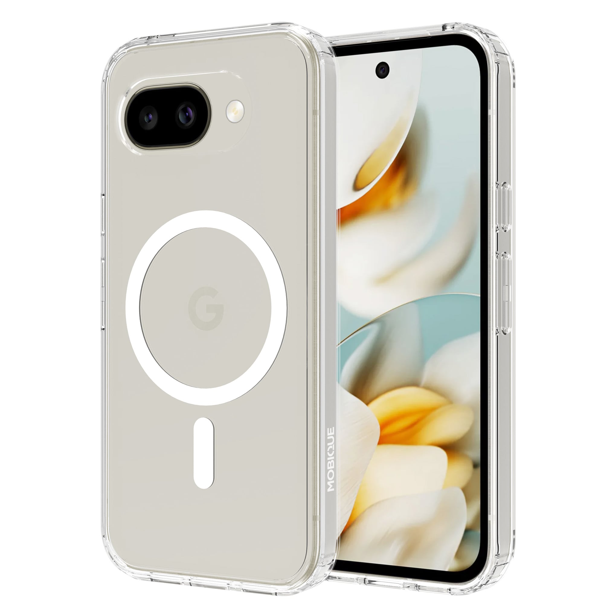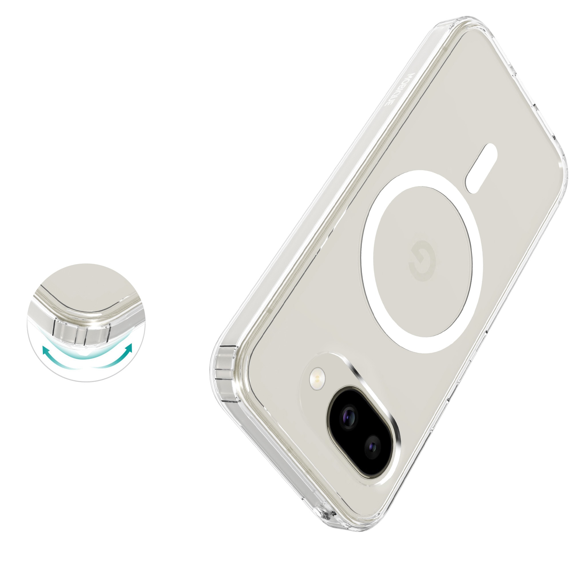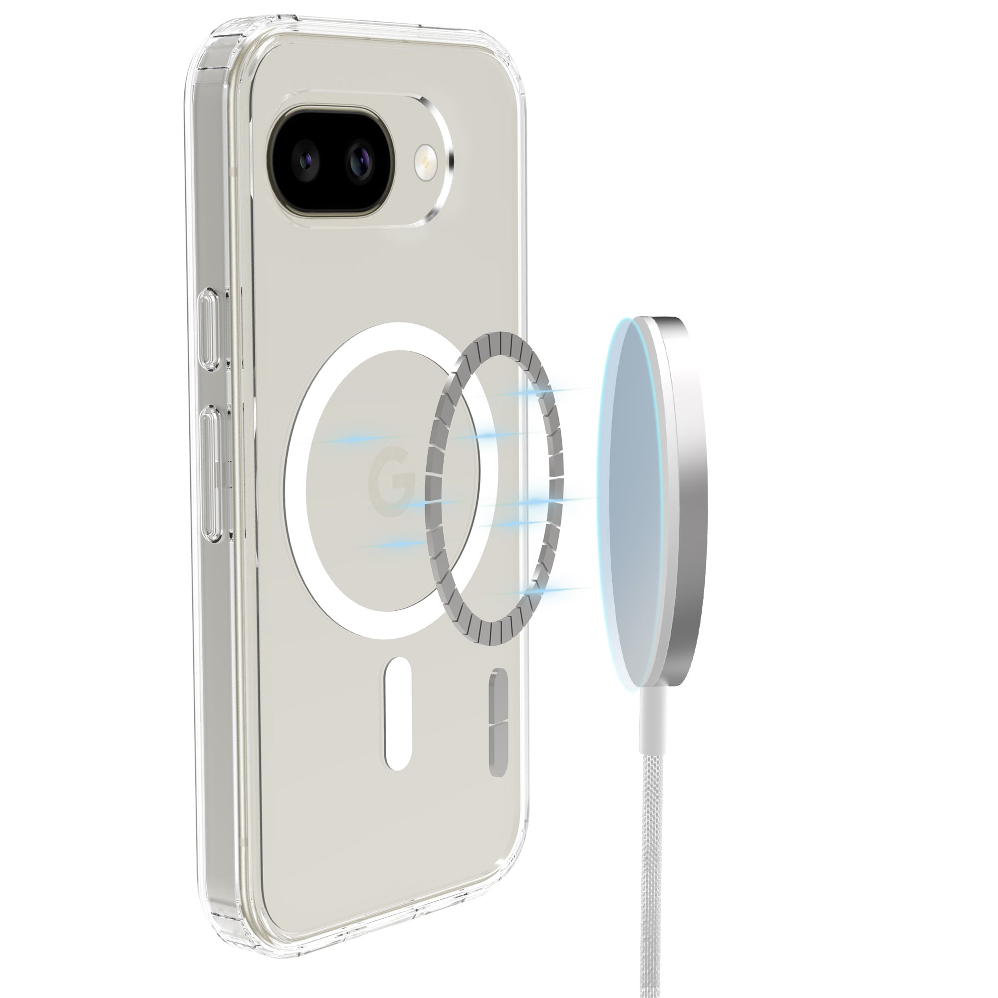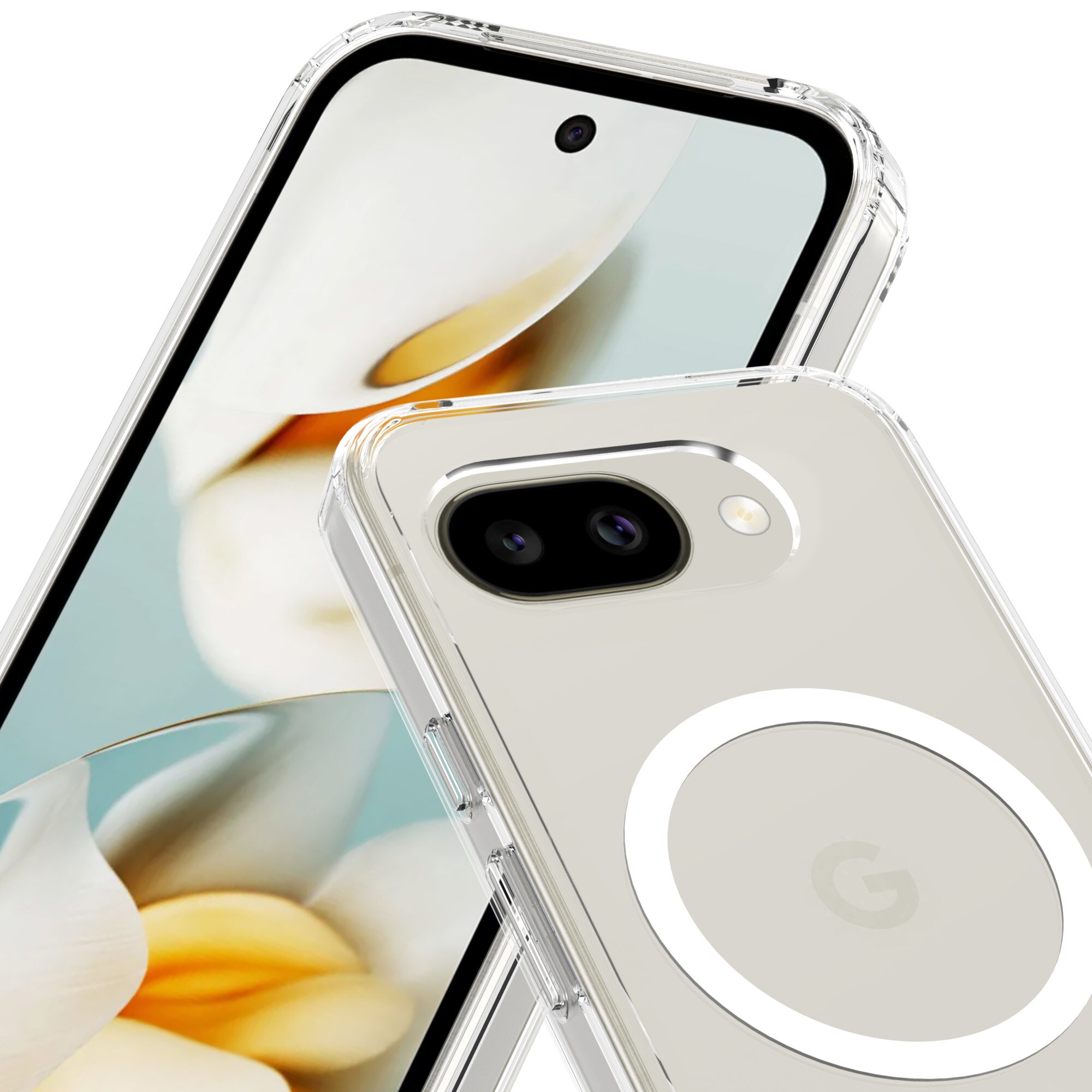Hybridhülle mit magnetischem Ring für Google Pixel 10a. Für optimalen Schutz vor Stößen und Stürzen ist die Hülle zweischichtig mit einem TPU-Kern und einer Außenschale aus Hartplastik. Der Ring auf der Rückseite ist magnetisch und kann mit MagSafe-kompatiblem Zubehör wie Ladegeräten und Kartenhaltern verwendet werden.