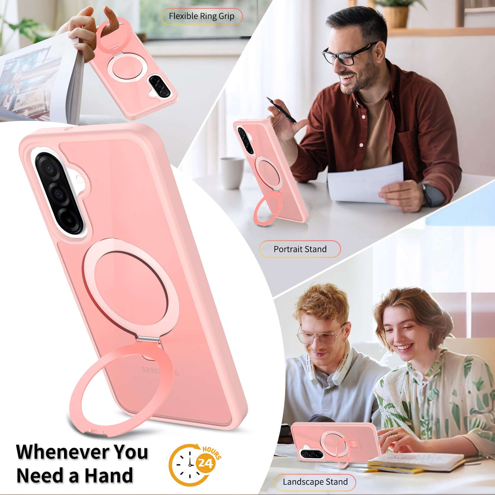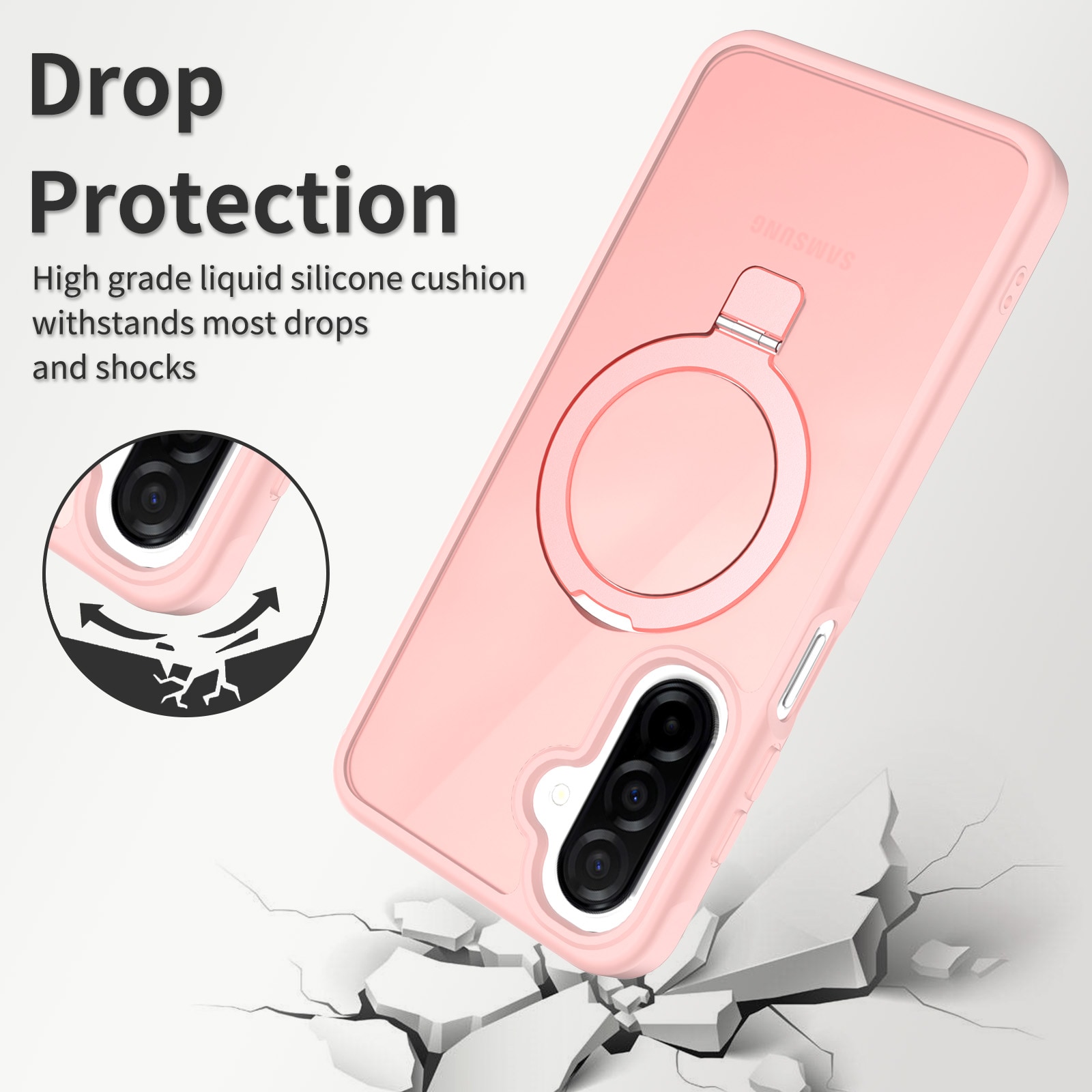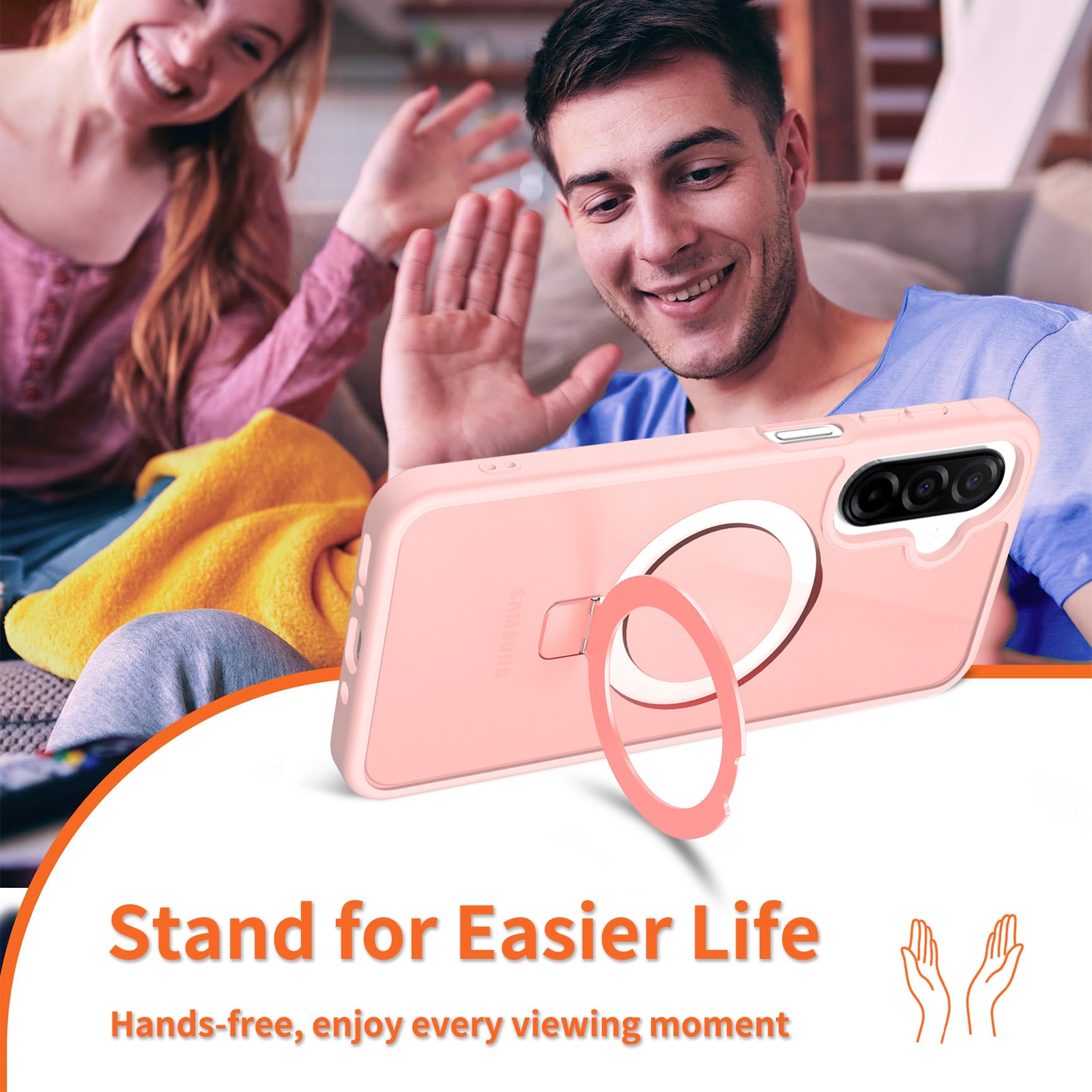 MagSafe Schutzhülle Hybrid für Samsung Galaxy A17. Für optimalen Schutz vor Stößen und Stürzen verfügt die Hülle über ein zweiteiliges Design mit einem TPU-Kern und einer Außenschale aus Hartplastik. Der Ring auf der Rückseite ist magnetisch und kompatibel mit MagSafe-Zubehör wie Ladegeräten und Kartenhaltern. Er kann außerdem als Ständer zum Ansehen von Filmen, Videos oder zum Spielen verwendet werden.