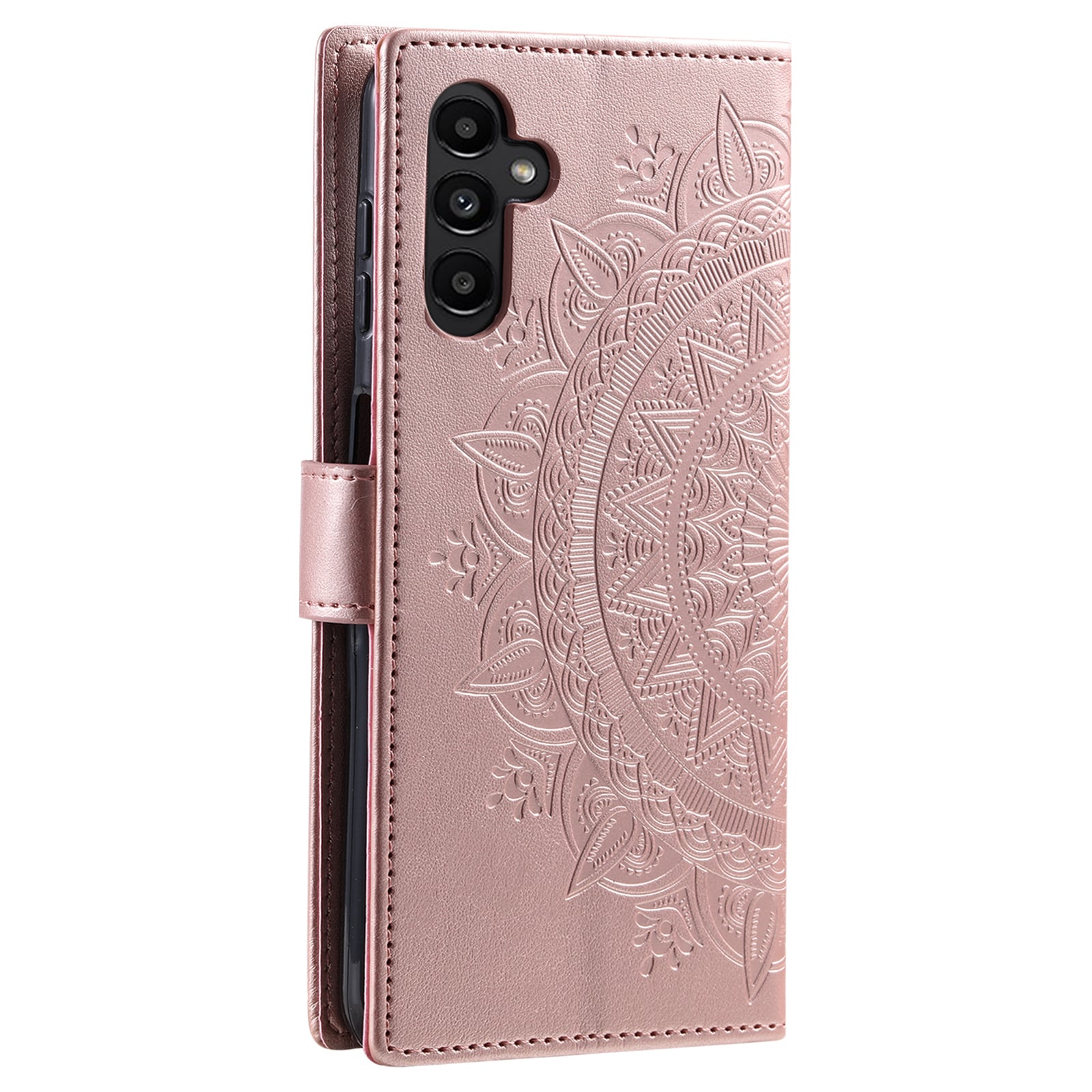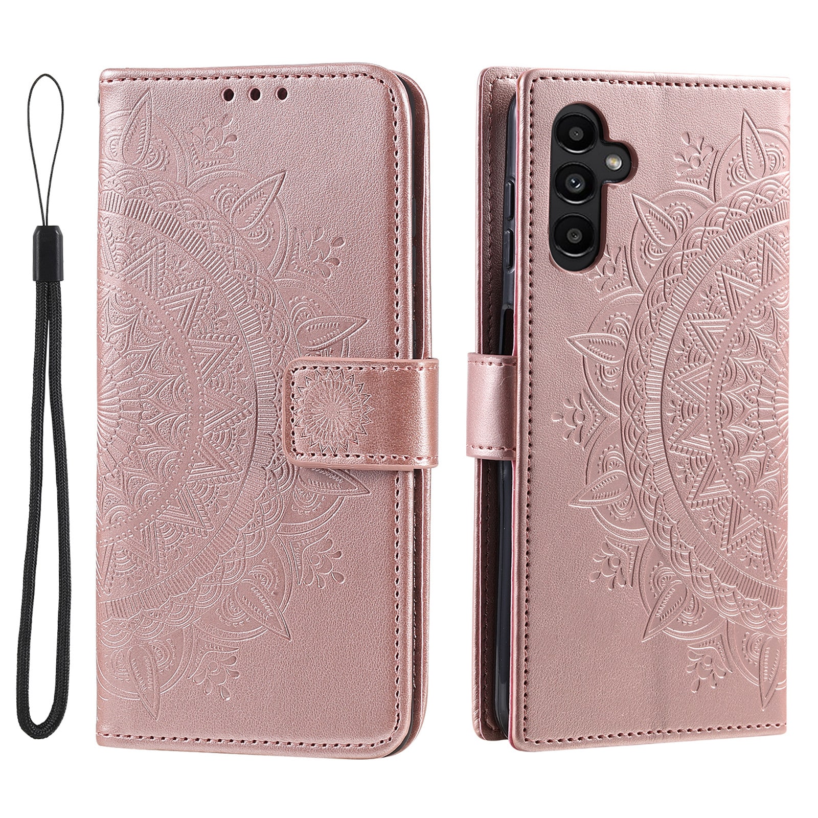 Gemusterte Handytasche für Samsung Galaxy A27. Schöne Handy-Hülle mit Kartenhalter, die ein herrliches Mandalassmotiv hat, und die dein Handy vor unnötigem Schaden und Verschleiß schützt. Mit Platz für Kreditkarten, Ausweisen und Geldscheinen so dass du das Portemonnaie oft zuhause lassen kannst. Die Hülle schützt den Display deines Handy effektiv und öffnet/schliesst sich mit Hilfe eines Magnetverschlusses. Ein abnehmbarer Tragegurt ist inbegriffen.