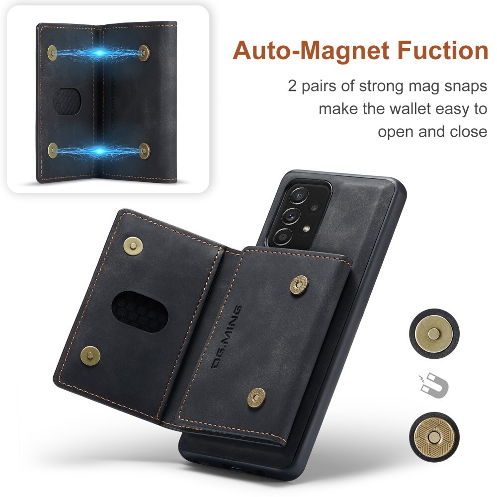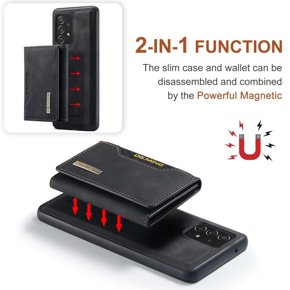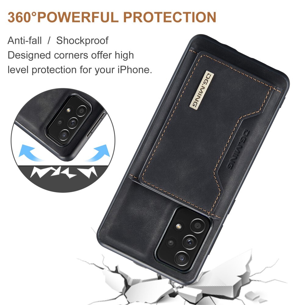 Hülle aus Kunstleder für Samsung Galaxy A52 5G mit passender Geldbörse. Die Geldbörse wird magnetisch auf der Rückseite der Hülle befestigt und kann leicht abgenommen werden, wenn du sie nicht benötigst. Durch Aufklappen der Geldbörse kann sie auch als Ständer verwendet werden, sodass du bequem Filme oder Videos ansehen kannst.