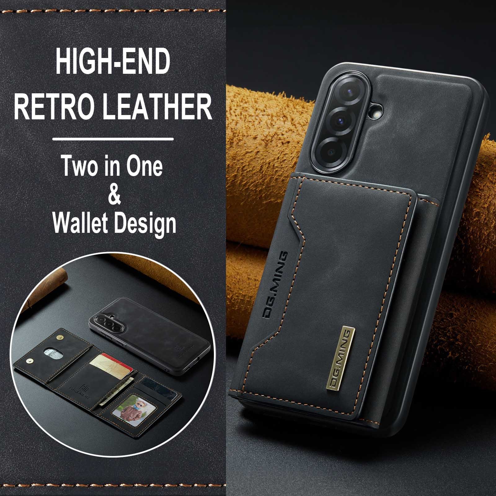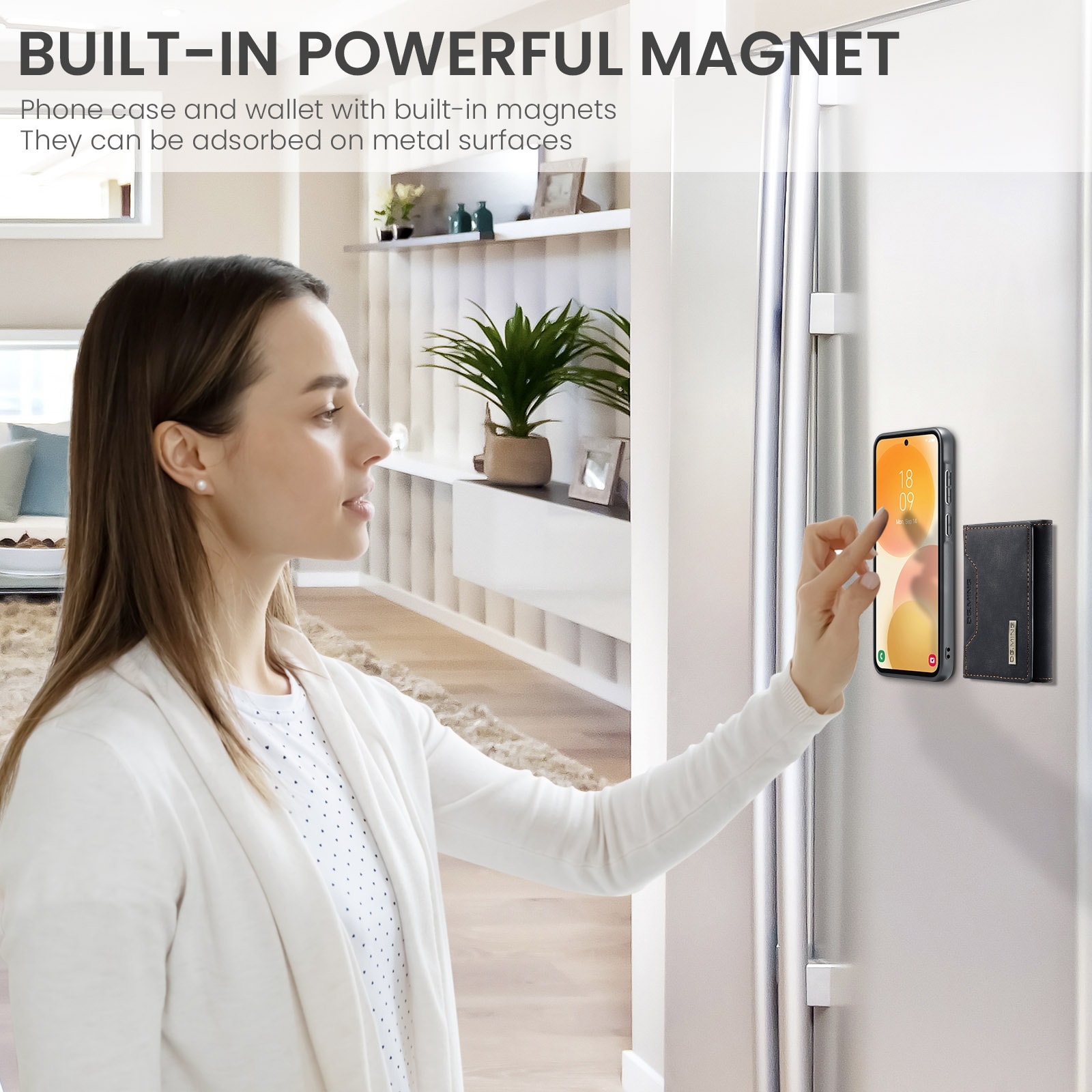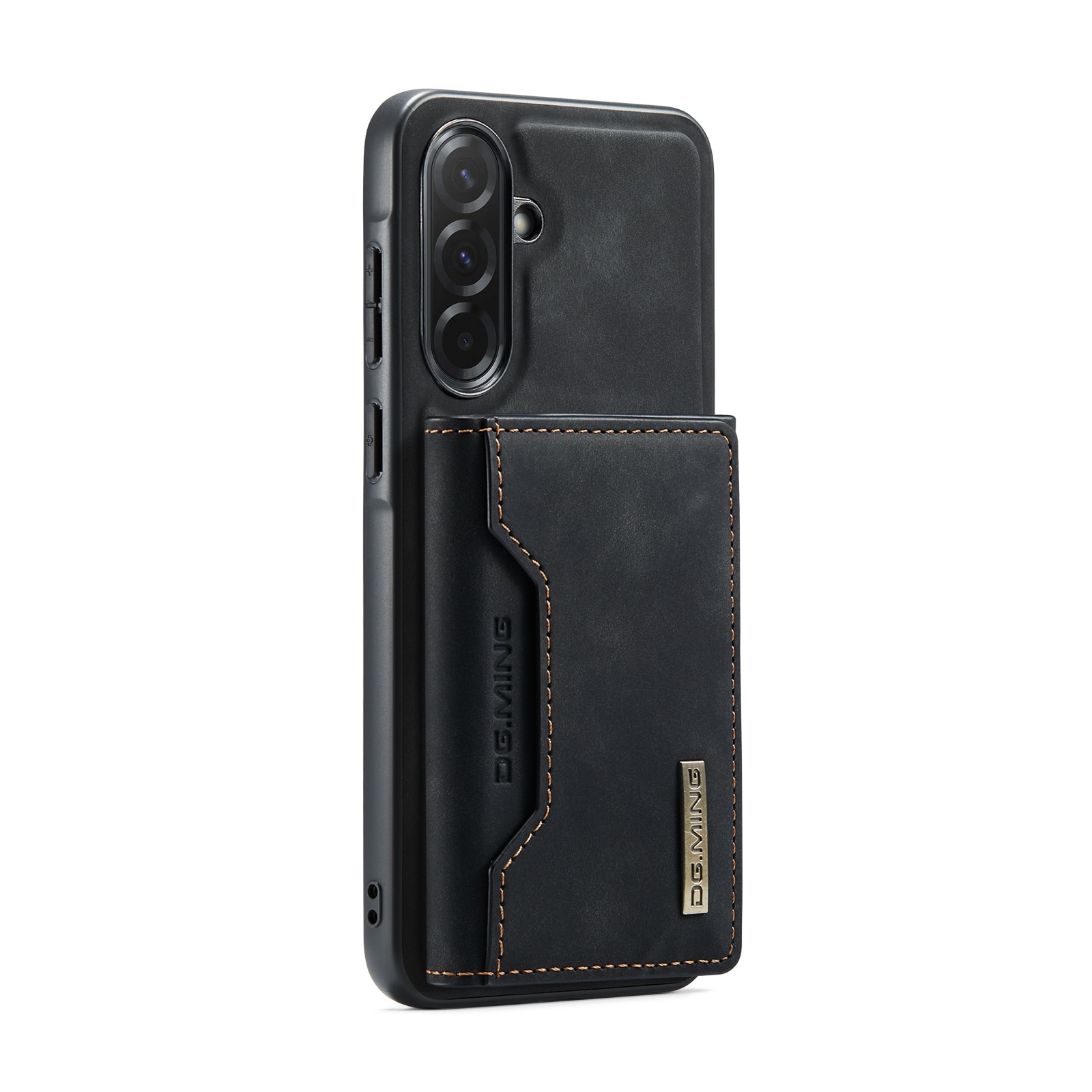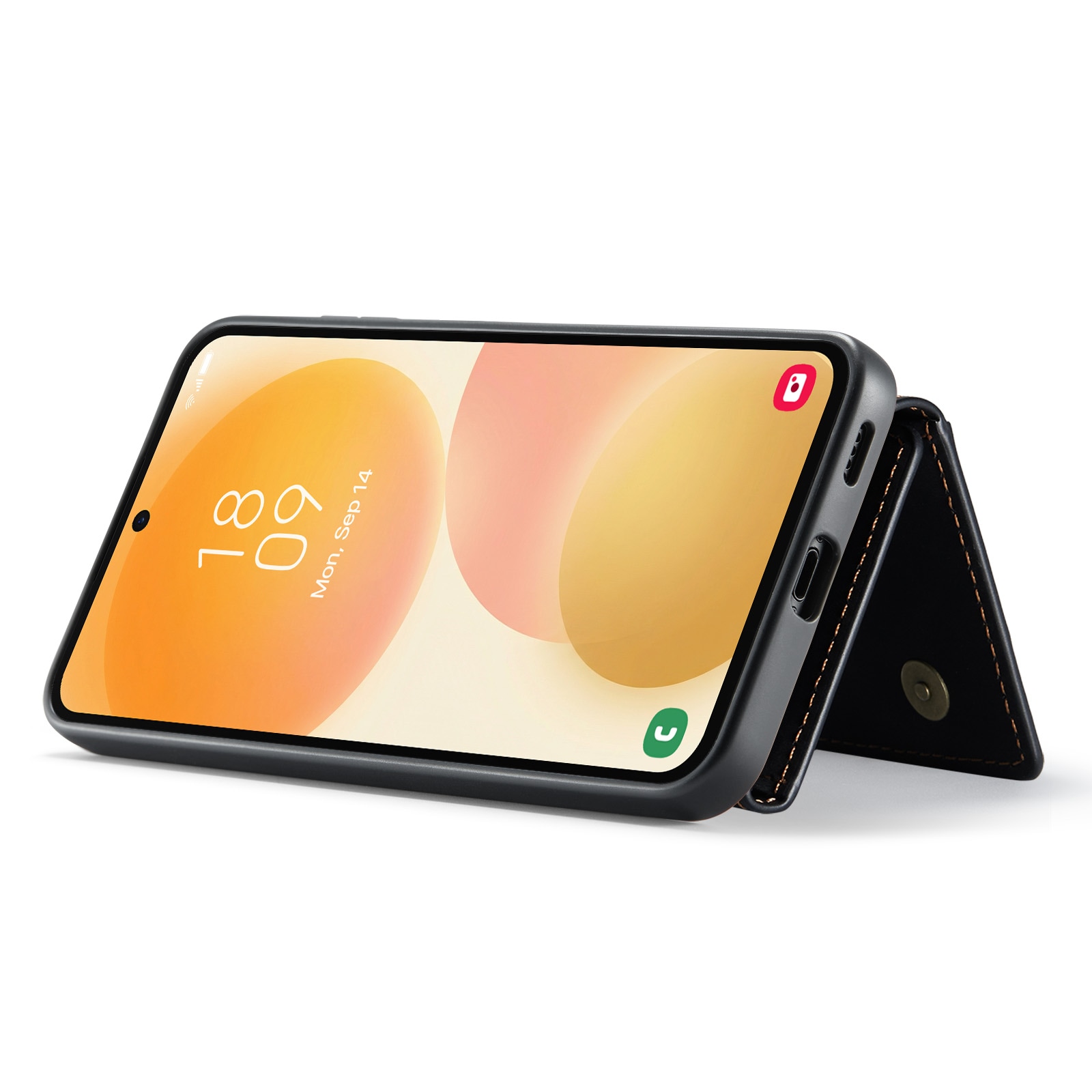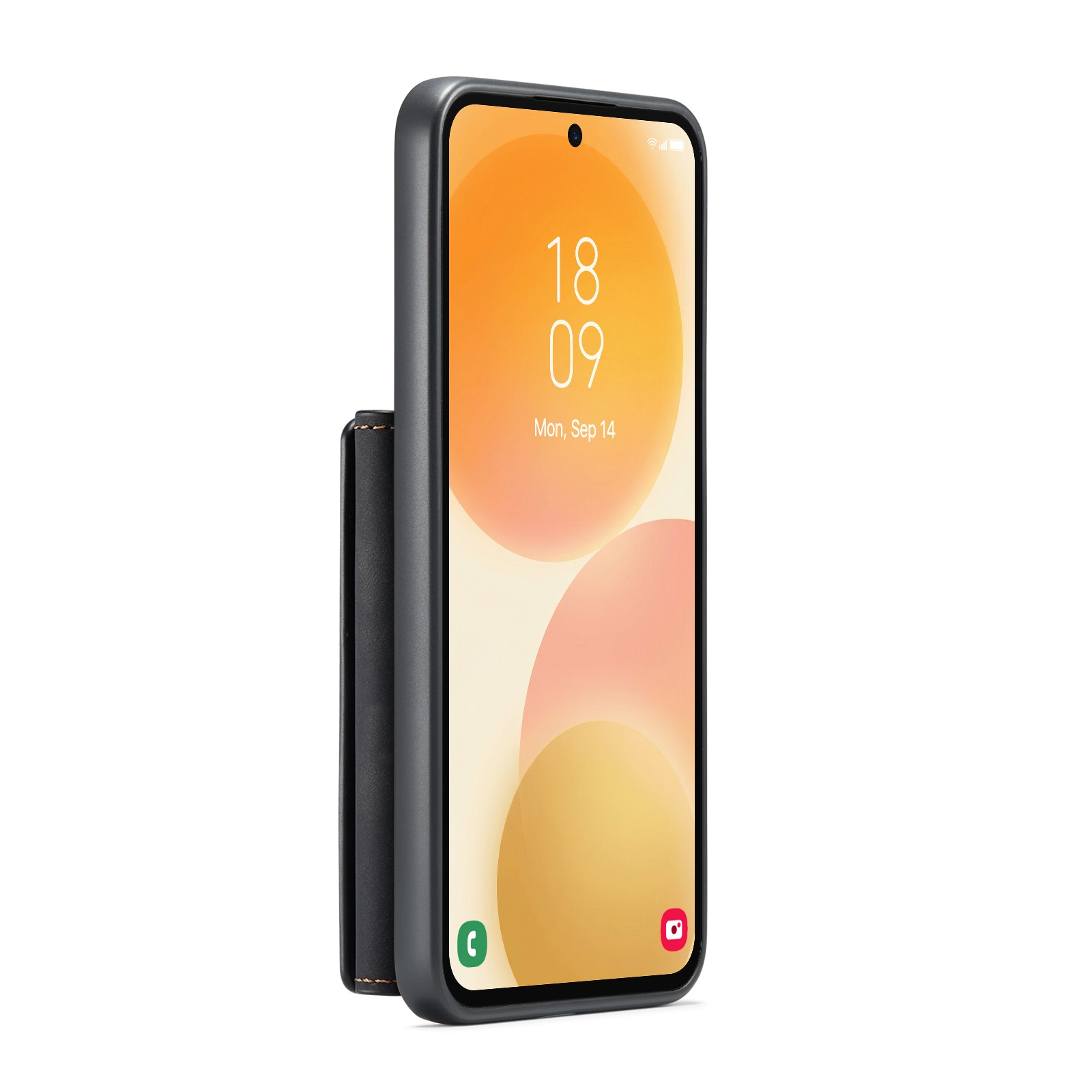 Hülle aus Kunstleder für Samsung Galaxy A57 mit passender Geldbörse. Die Geldbörse wird magnetisch auf der Rückseite der Hülle befestigt und kann leicht abgenommen werden, wenn du sie nicht benötigst. Durch Aufklappen der Geldbörse kann sie auch als Ständer verwendet werden, sodass du bequem Filme oder Videos ansehen kannst.