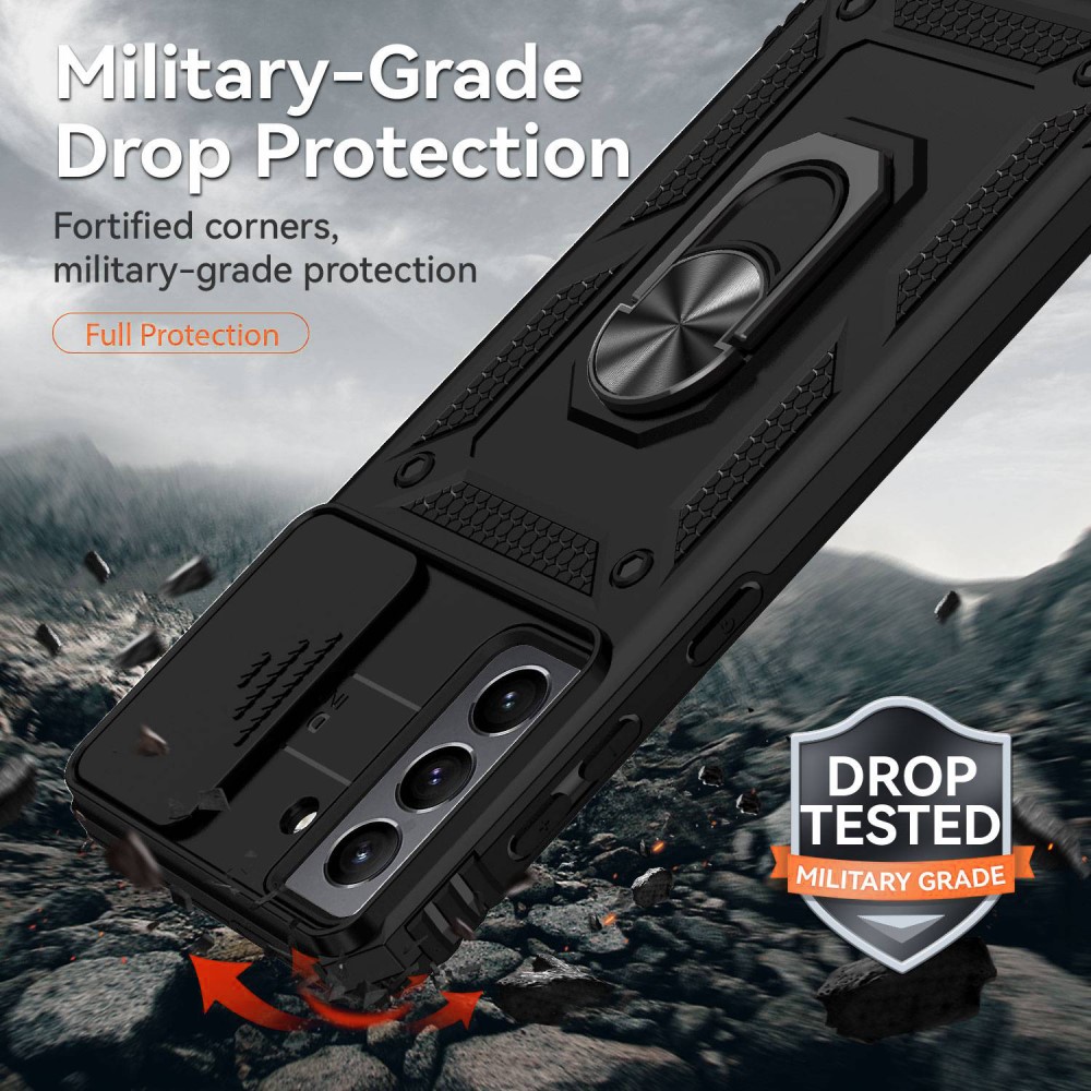 Schutzhülle Hybrid mit ausklappbarem Ring für Samsung Galaxy S21 FE. Für optimalen Schutz vor Stößen und Stürzen besteht die Hülle aus drei Teilen: einem TPU-Kern, einer Außenschale aus Hartplastik und einem schützenden Rahmen rund um das Display. Der Ring auf der Rückseite kann ausgeklappt werden, um einen sicheren Halt zu bieten. Er kann auch als Ständer verwendet werden, um Filme, Videos oder Spiele anzusehen.