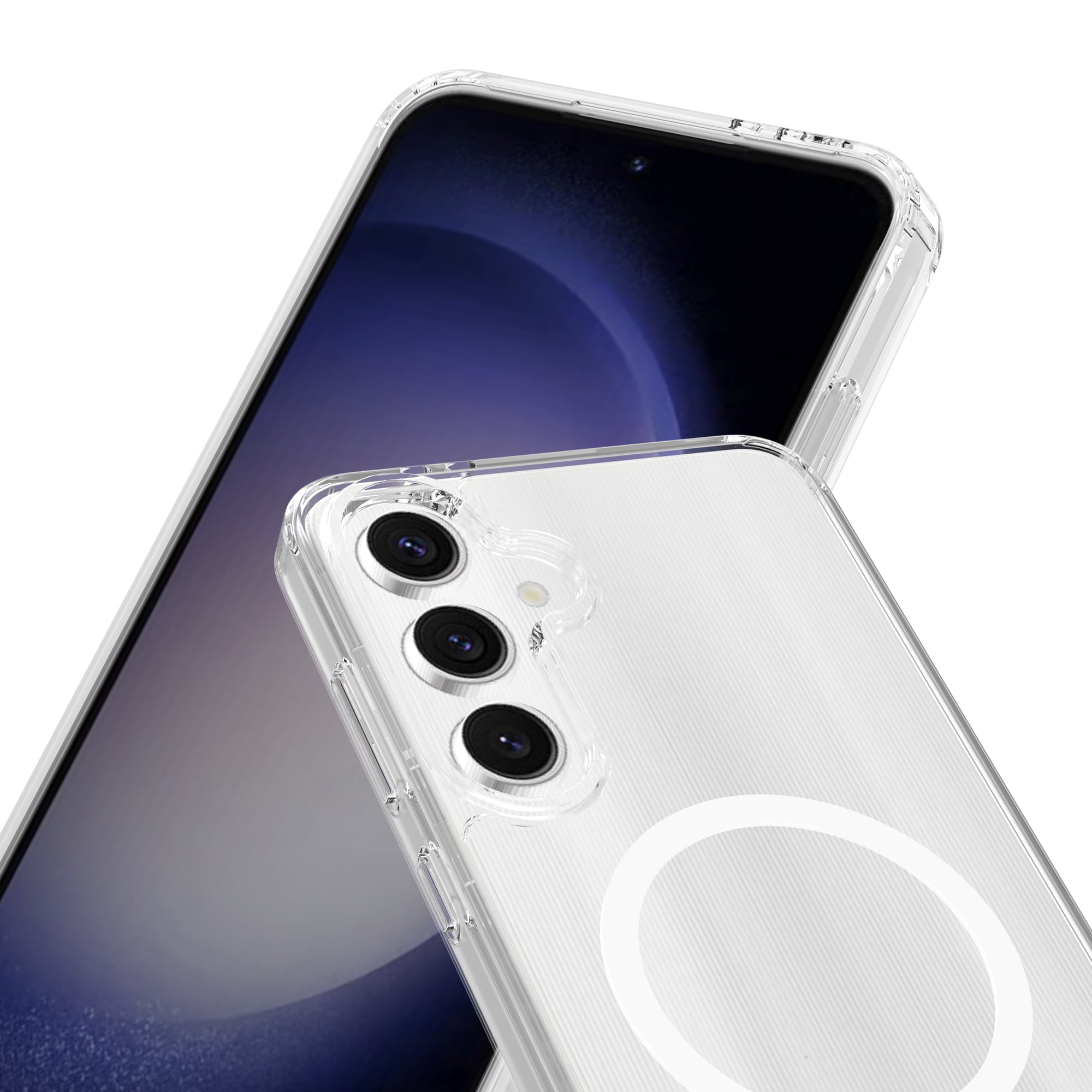 Hybridhülle mit magnetischem Ring für Samsung Galaxy S24 FE. Für optimalen Schutz vor Stößen und Stürzen ist die Hülle zweischichtig mit einem TPU-Kern und einer Außenschale aus Hartplastik. Der Ring auf der Rückseite ist magnetisch und kann mit MagSafe-kompatiblem Zubehör wie Ladegeräten und Kartenhaltern verwendet werden.