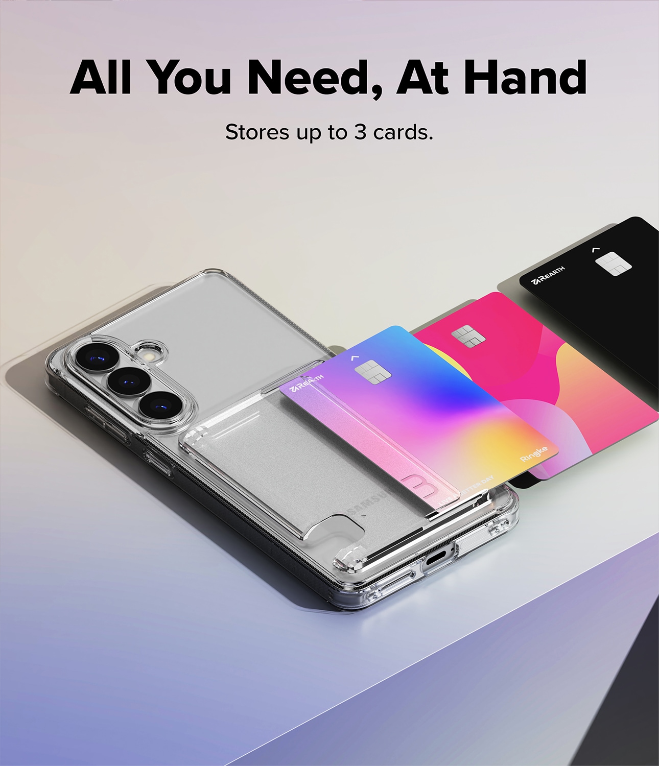 Handyhülle mit Kartenhalter für Samsung Galaxy S26 Plus. Die Ringke Fusion Card fügt ein praktisches Kartenfach auf der Rückseite deines Handys hinzu – perfekt für deine Fahrkarte, Zugangskarte oder Bankkarte.