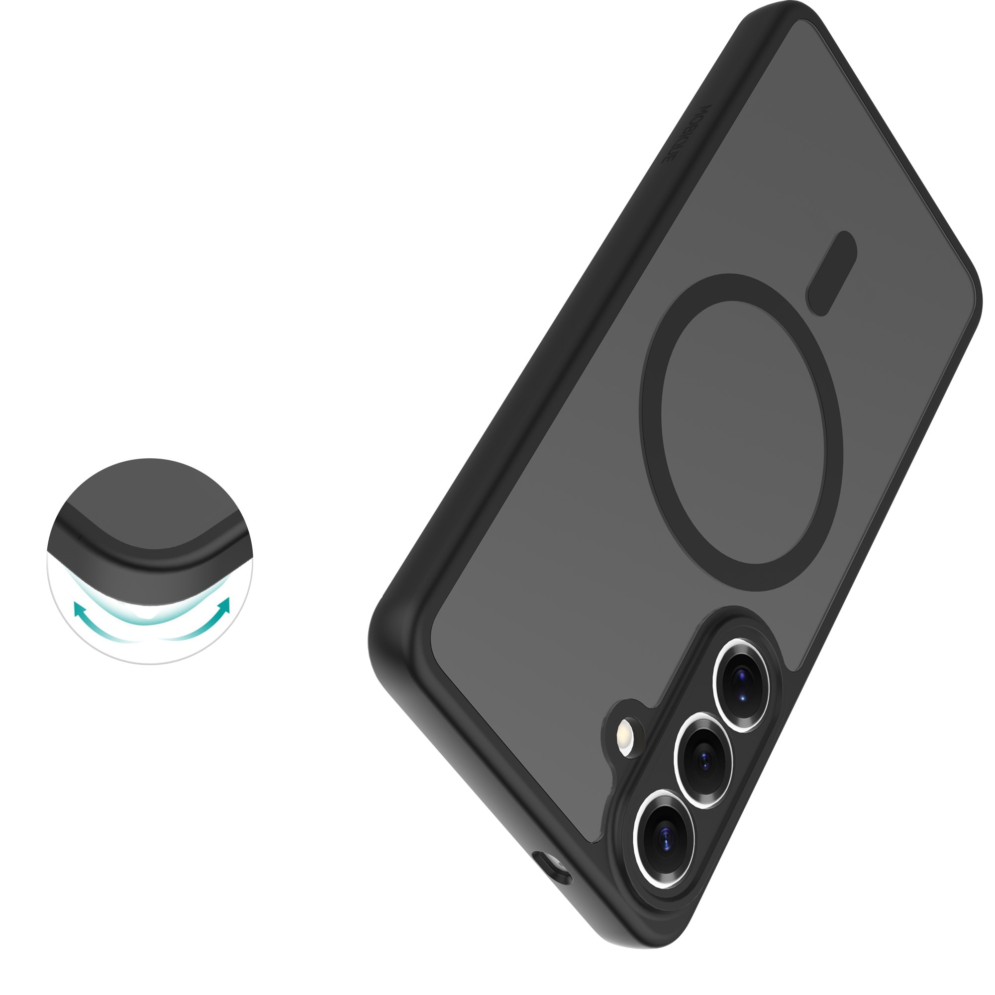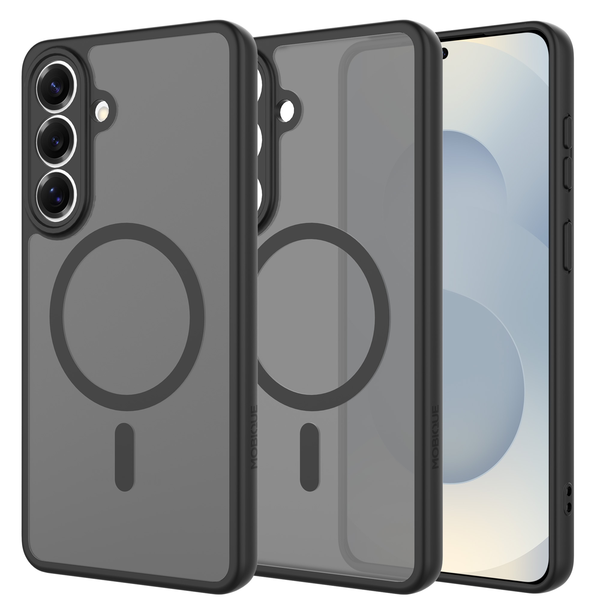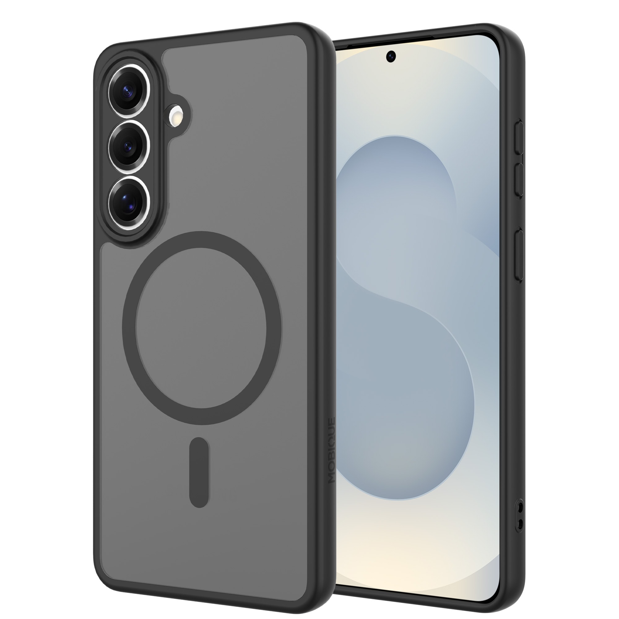 Hybrid-Hülle mit magnetischem Ring für Samsung Galaxy S26 Plus von Mobique. Die Hülle verfügt über ein elegantes, mattes Finish und ist mit einem magnetischen Ring auf der Rückseite ausgestattet. Der Ring ermöglicht eine nahtlose Kompatibilität mit MagSafe-Zubehör wie Ladegeräten und Kartenhaltern.