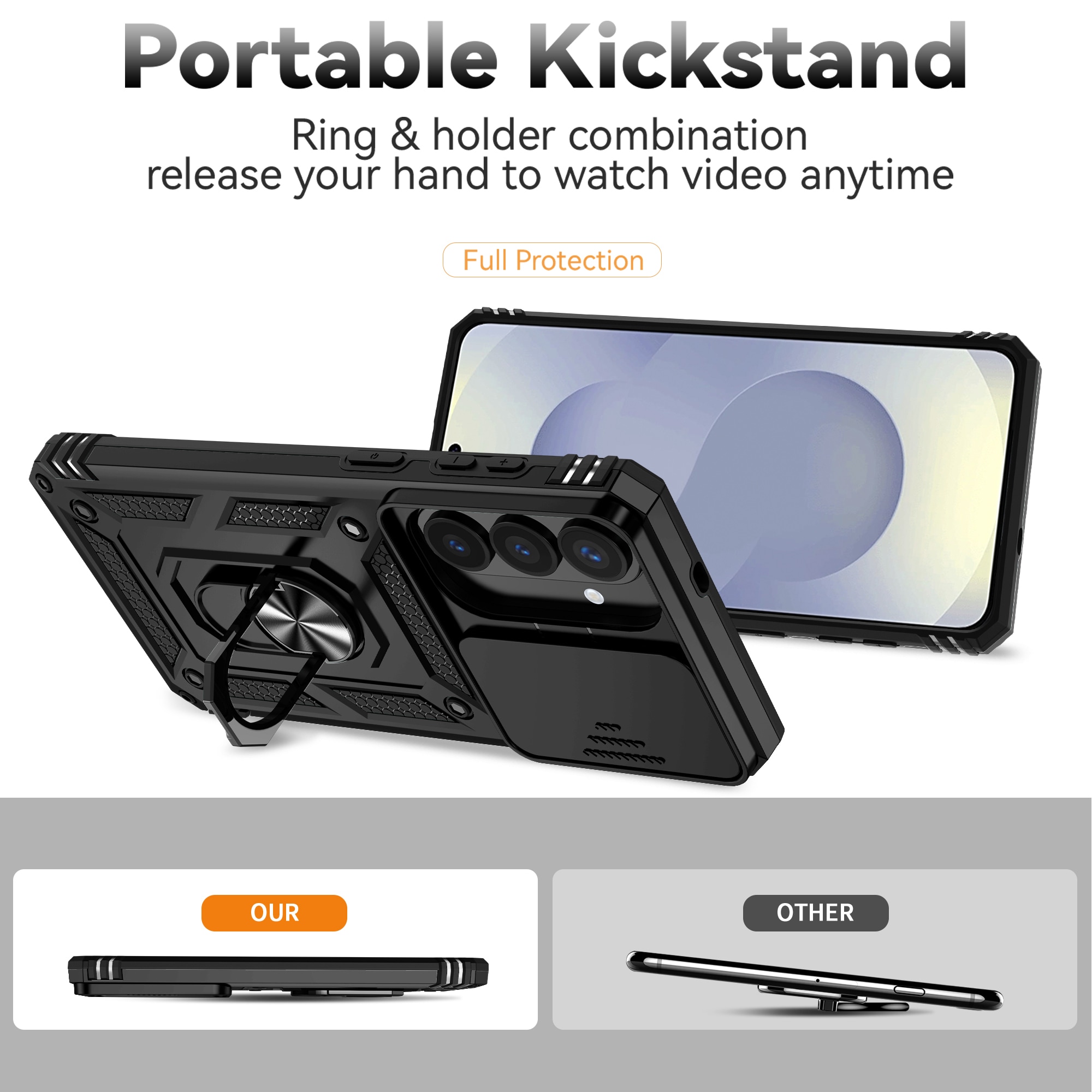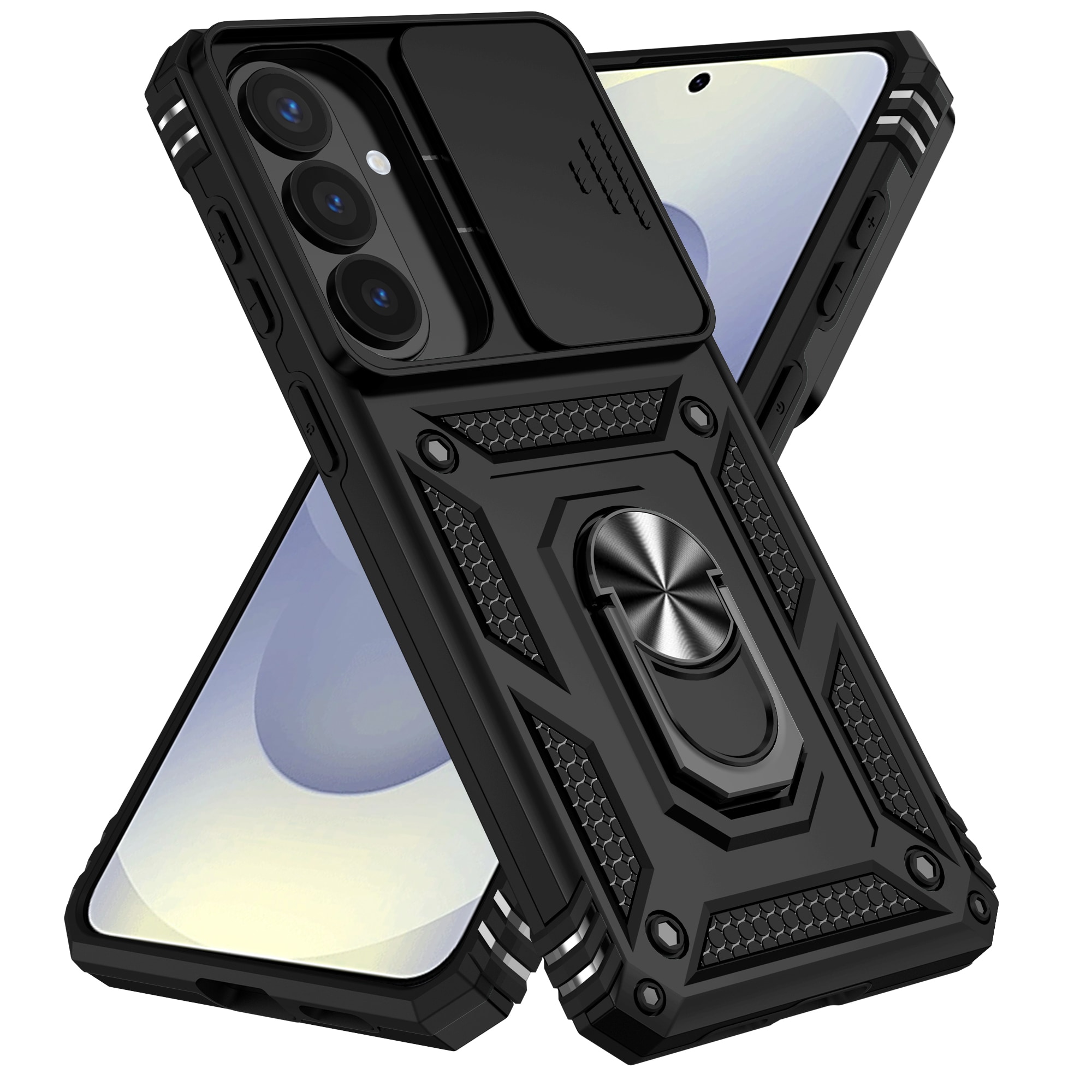 Schutzhülle Hybrid mit ausklappbarem Ring für Samsung Galaxy S26 Plus. Für optimalen Schutz vor Stößen und Stürzen besteht die Hülle aus drei Teilen: einem TPU-Kern, einer Außenschale aus Hartplastik und einem schützenden Rahmen rund um das Display. Der Ring auf der Rückseite kann ausgeklappt werden, um einen sicheren Halt zu bieten. Er kann auch als Ständer verwendet werden, um Filme, Videos oder Spiele anzusehen.