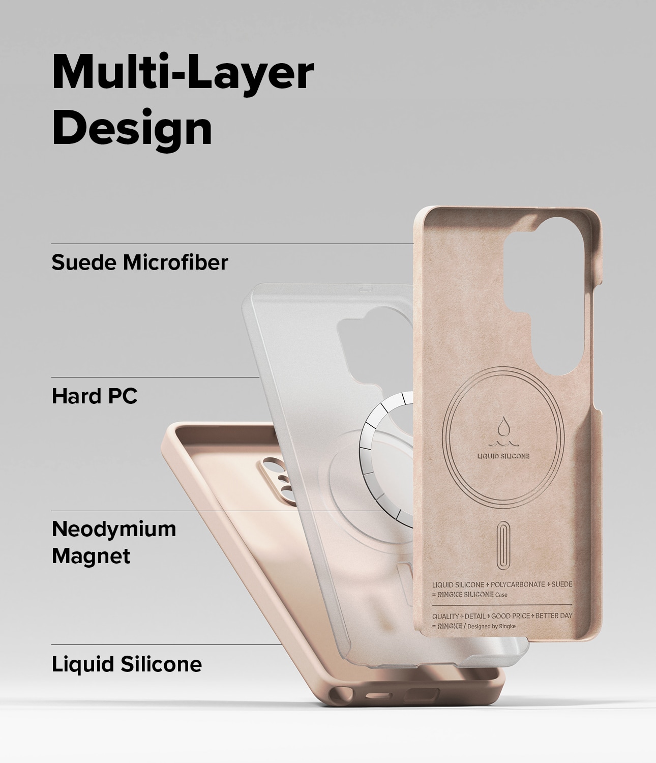 Die Hülle besteht aus drei Schichten für optimalen Schutz: eine griffige und strapazierfähige Außenseite aus Silikon, ein harter Polycarbonatkern zum Schutz vor Stößen und Stürzen, sowie ein weiches Innenfutter aus Mikrofaser zum Schutz vor Kratzern.
