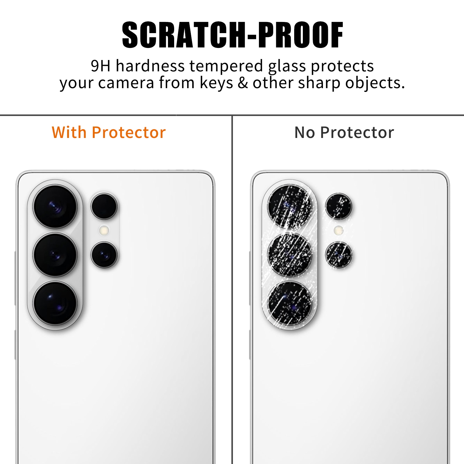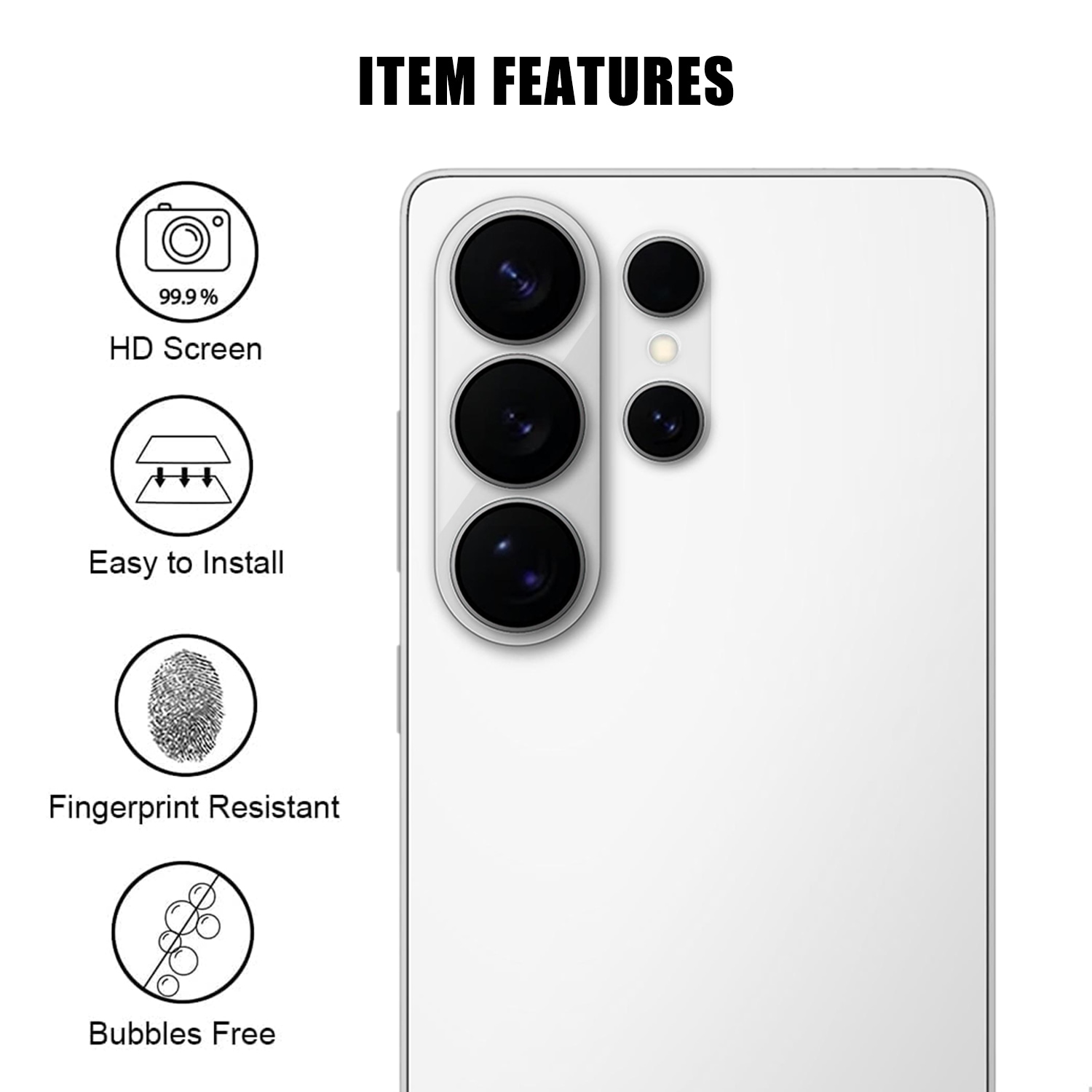 Kameraobjektivschutz aus gehärtetem Glas für Samsung Galaxy S26 Ultra, entwickelt zum Schutz des Kameramoduls vor Kratzern, Stößen und äußerer Abnutzung. Der Schutz ist vollflächig und bedeckt sowohl die Linsen als auch das Kameragehäuse. Im montierten Zustand ist der Schutz dezent und beeinträchtigt das Erscheinungsbild des Telefons nicht.
