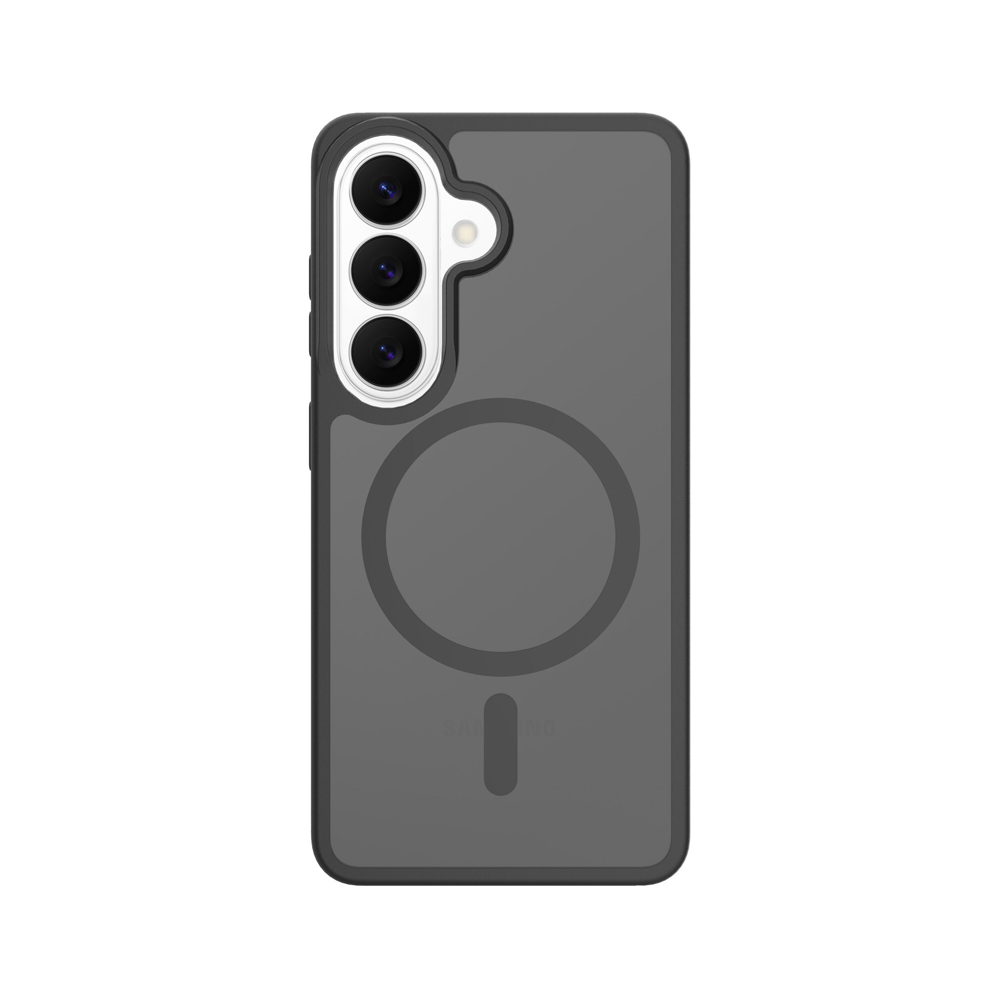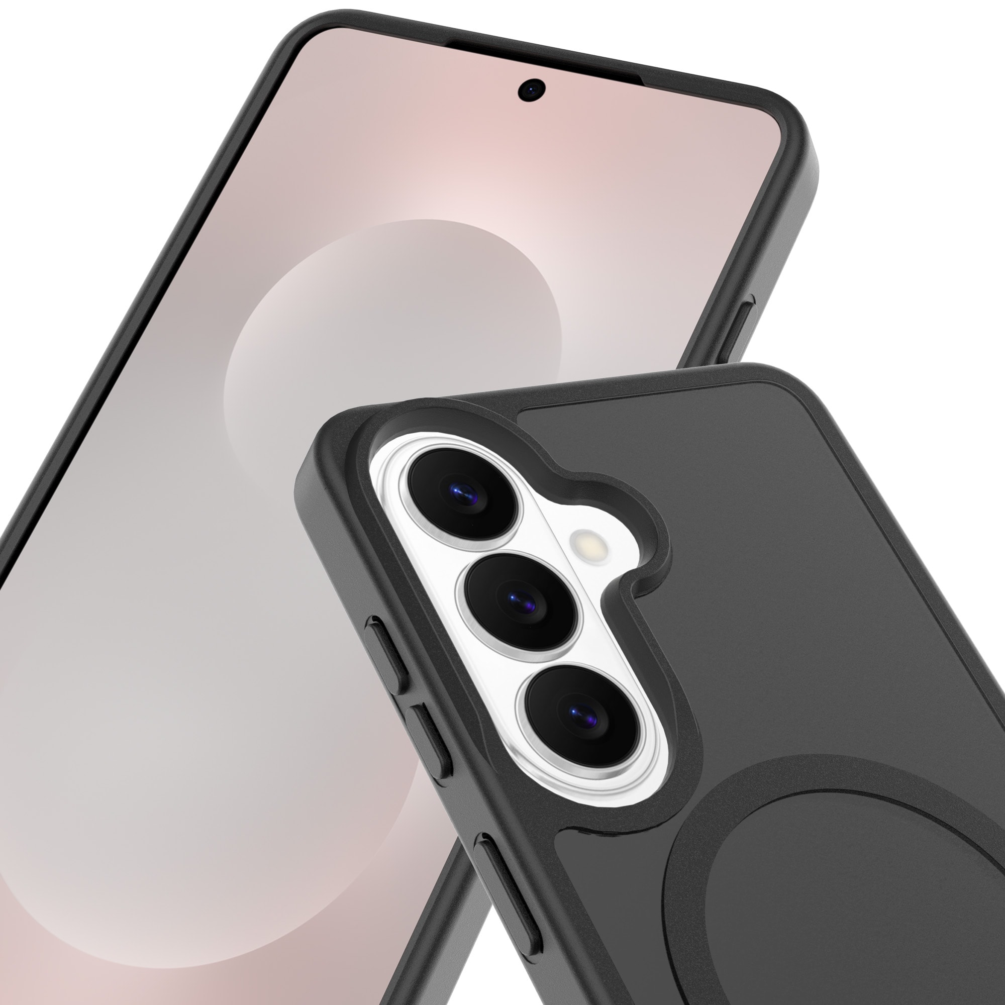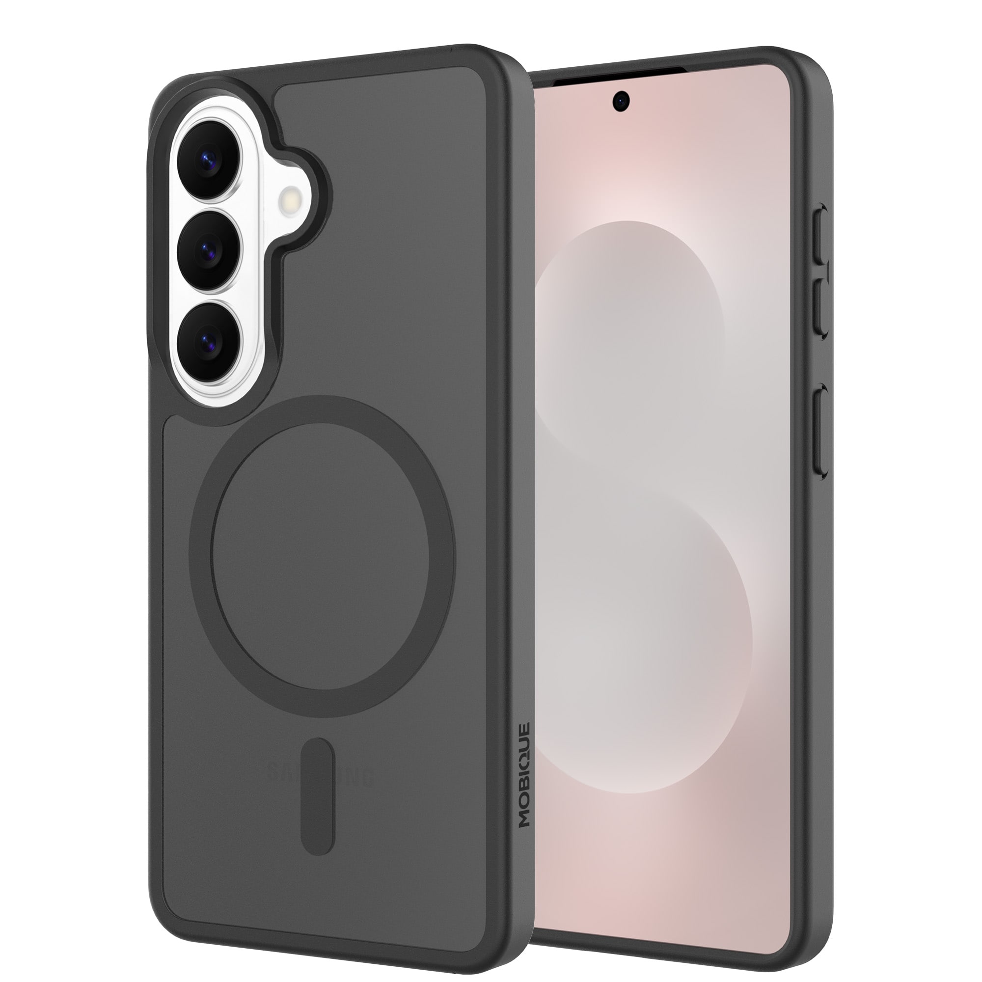 Hybrid-Hülle mit magnetischem Ring für Samsung Galaxy S26 von Mobique. Die Hülle verfügt über ein elegantes, mattes Finish und ist mit einem magnetischen Ring auf der Rückseite ausgestattet. Der Ring ermöglicht eine nahtlose Kompatibilität mit MagSafe-Zubehör wie Ladegeräten und Kartenhaltern.