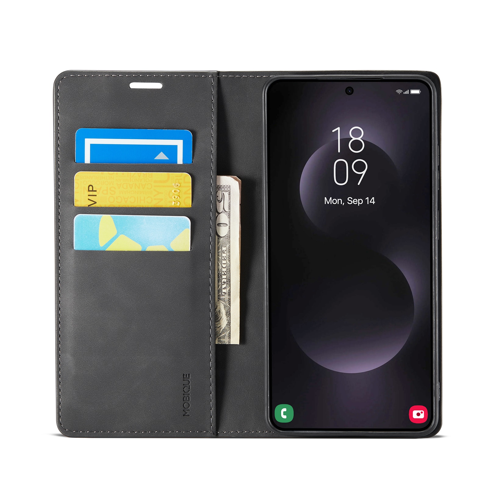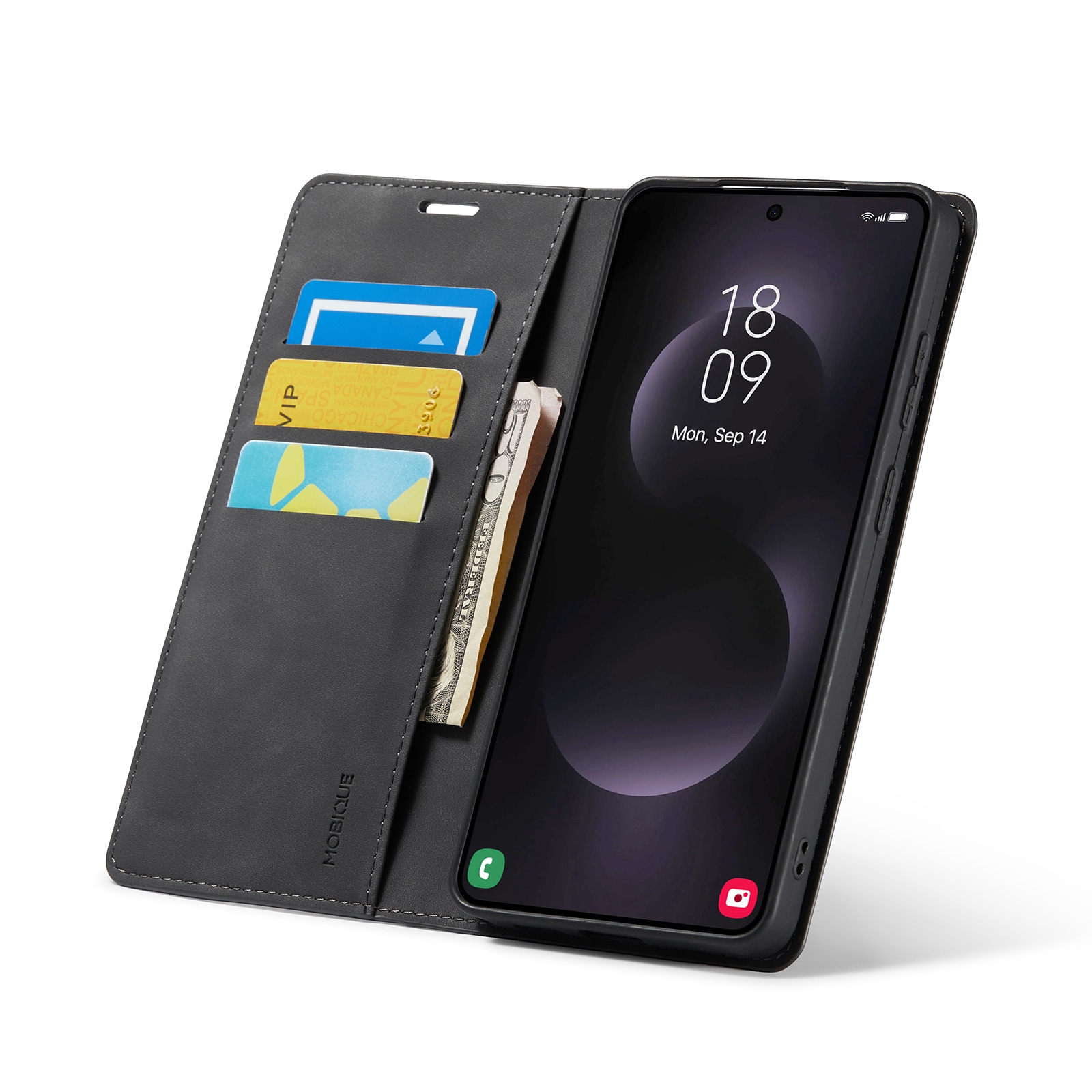 Auf der Innenseite der Klappe befinden sich Kartenfächer mit Platz für bis zu zwei Karten. Zudem gibt es ein Fach für Quittungen und Geldscheine. Das Etui wird mit diskreten Magneten, die in der Klappe integriert sind, sicher verschlossen.