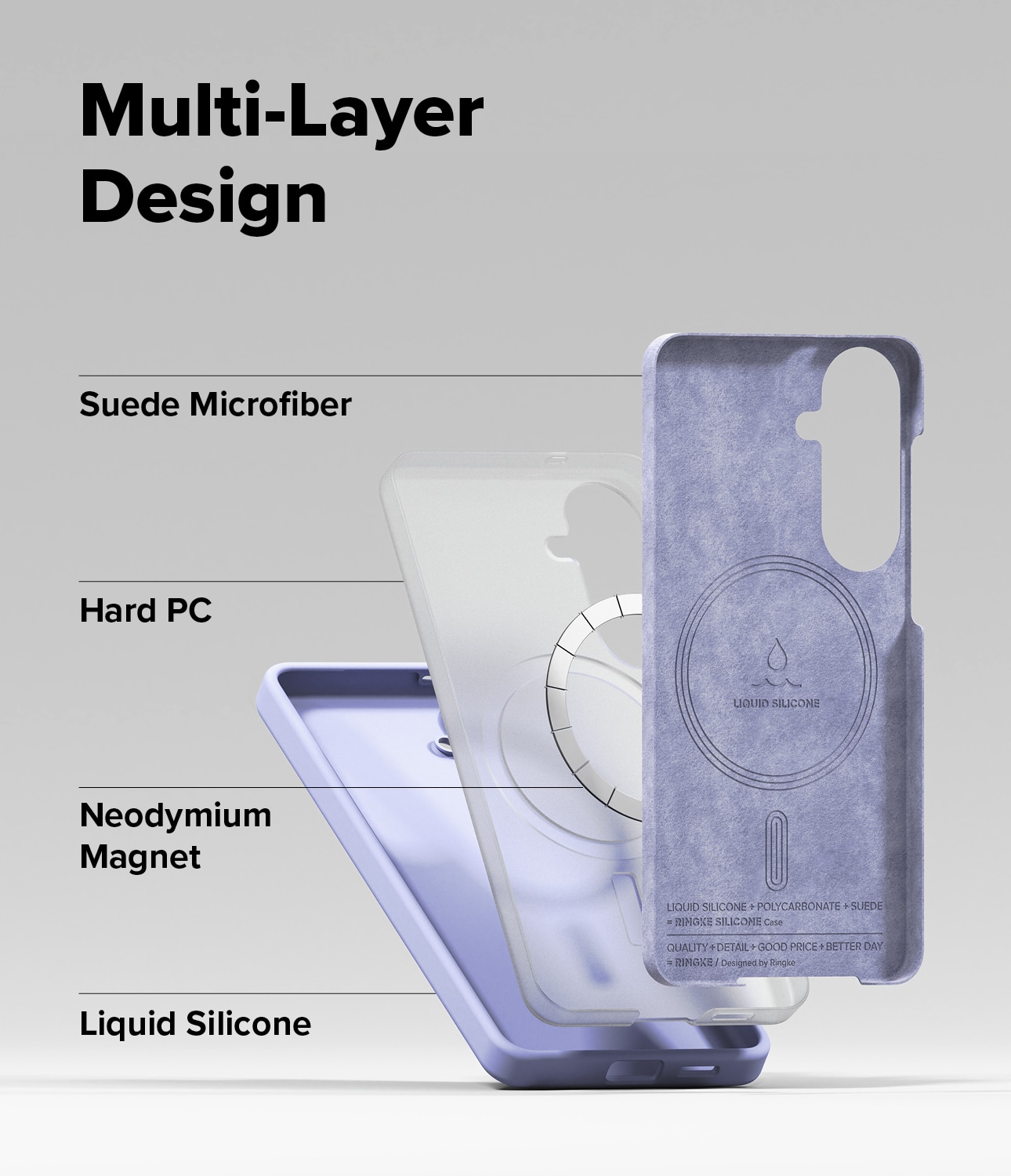 Die Hülle besteht aus drei Schichten für optimalen Schutz: eine griffige und strapazierfähige Außenseite aus Silikon, ein harter Polycarbonatkern zum Schutz vor Stößen und Stürzen, sowie ein weiches Innenfutter aus Mikrofaser zum Schutz vor Kratzern.