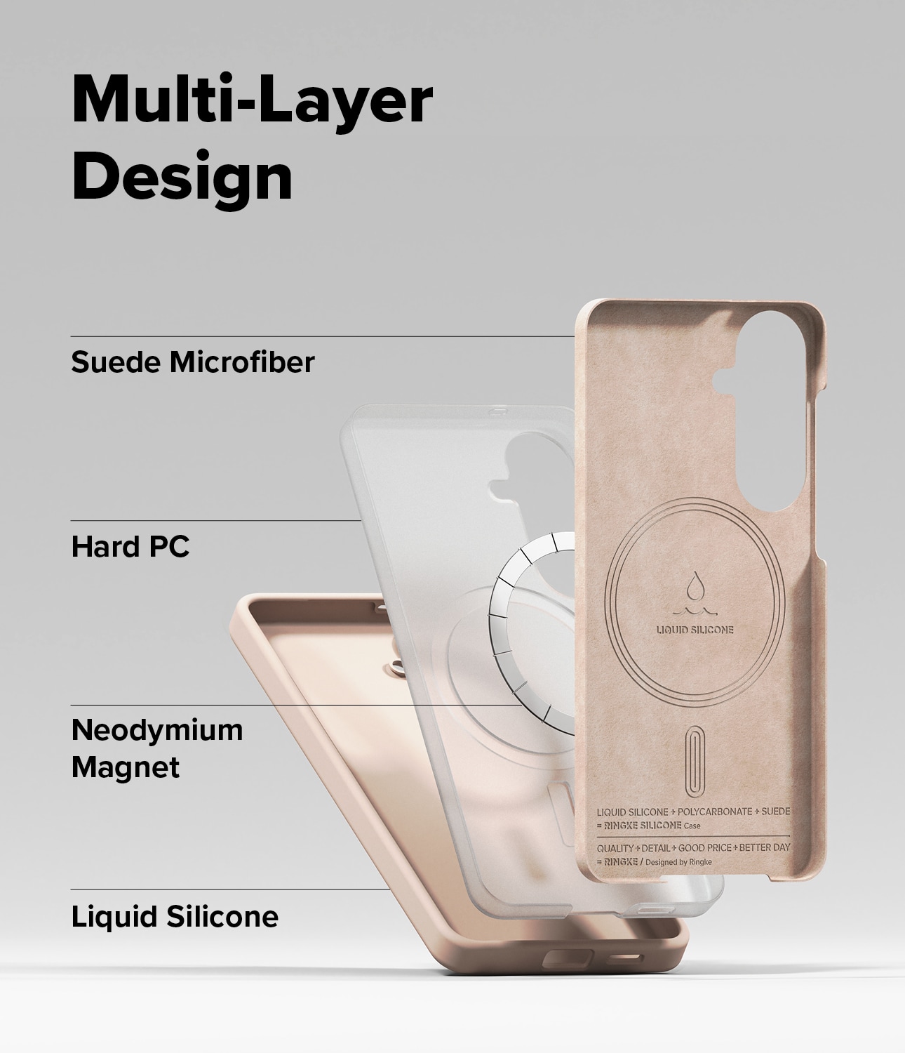 Die Hülle besteht aus drei Schichten für optimalen Schutz: eine griffige und strapazierfähige Außenseite aus Silikon, ein harter Polycarbonatkern zum Schutz vor Stößen und Stürzen, sowie ein weiches Innenfutter aus Mikrofaser zum Schutz vor Kratzern.