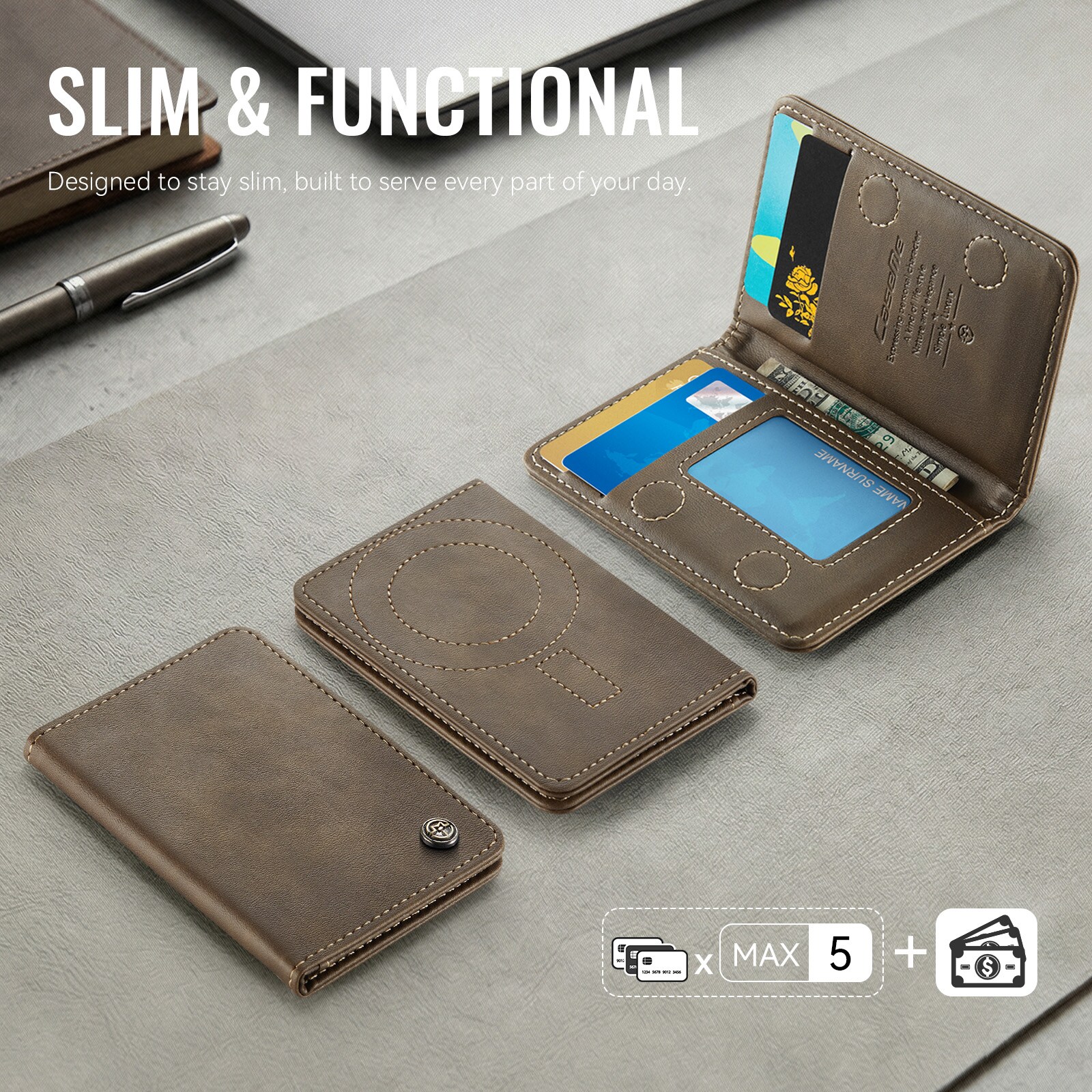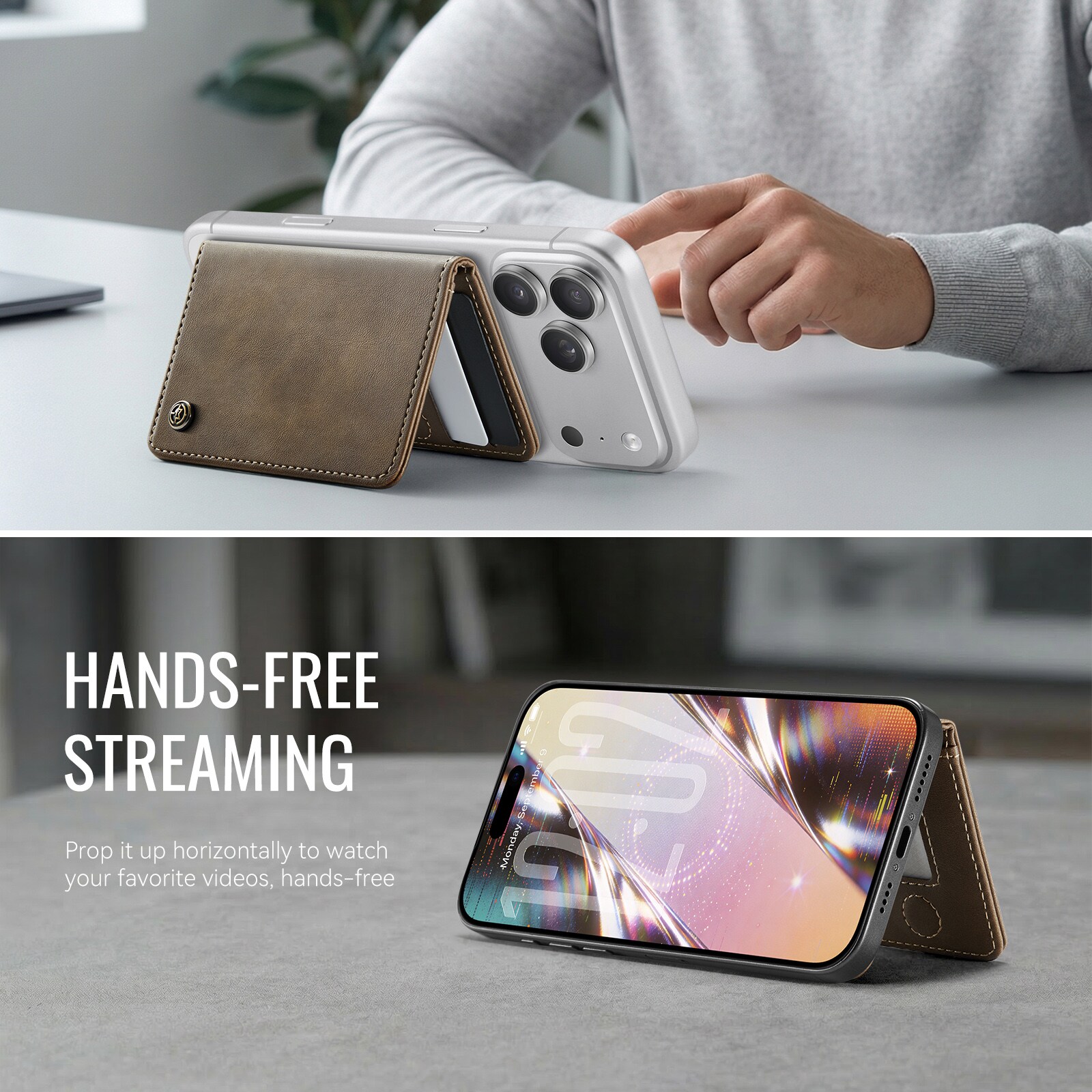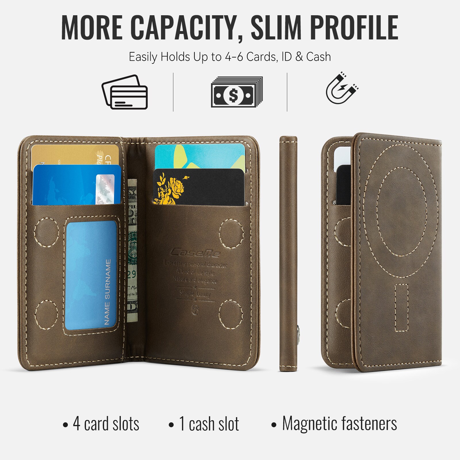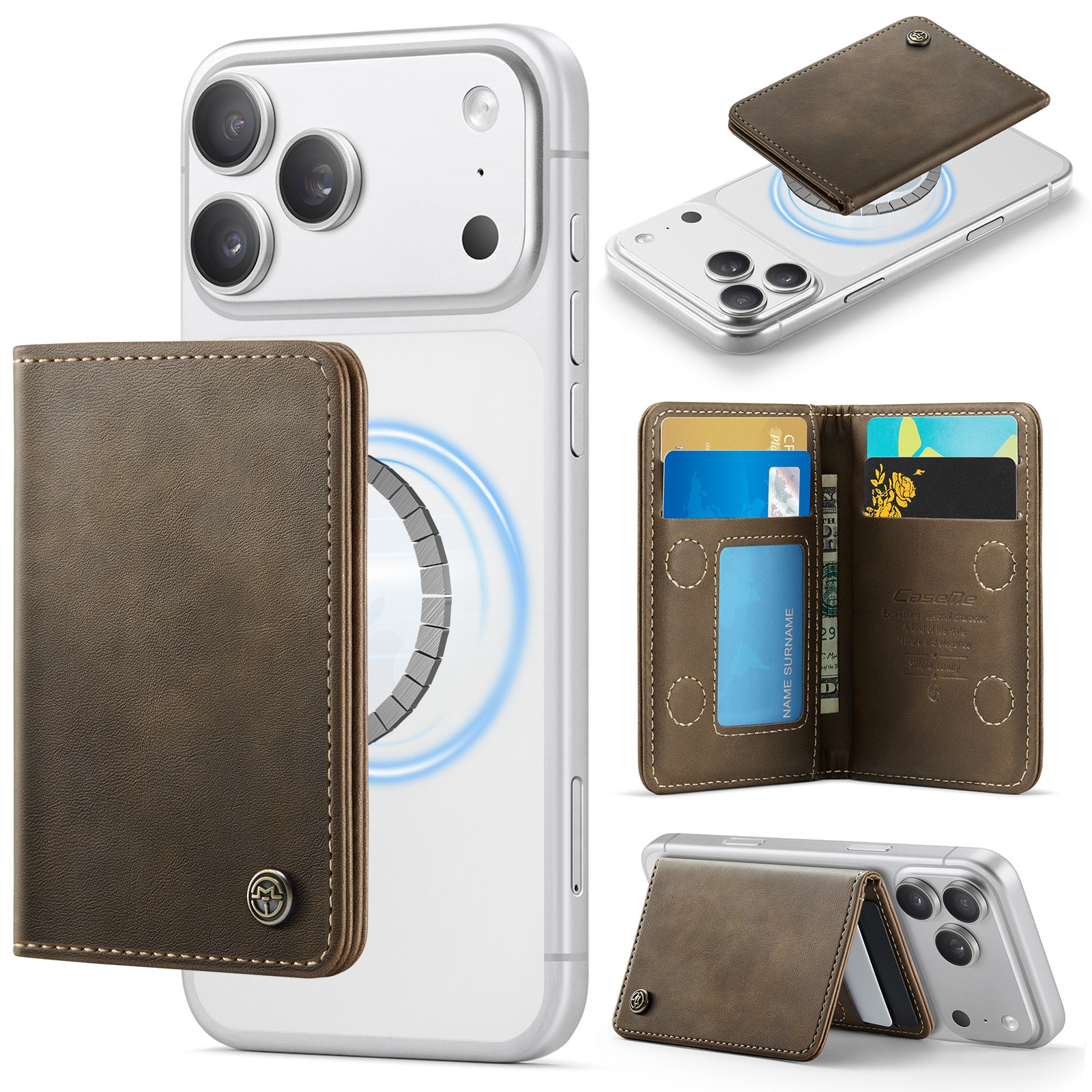 MagSafe Leder Geldbörse mit schlankem Design und praktischer Ständerfunktion von CaseMe. Dieser stilvolle und kompakte Kartenhalter bietet Platz für bis zu 4 Karten sowie Bargeld und dient gleichzeitig als praktischer Handyhalter für die freihändige Nutzung. Perfekt zum Ansehen von Videos, für Anrufe oder zum Surfen ohne das Smartphone in der Hand zu halten. Mit integriertem RFID-Schutz sind deine Karten und persönlichen Daten vor unbefugtem Scannen geschützt.