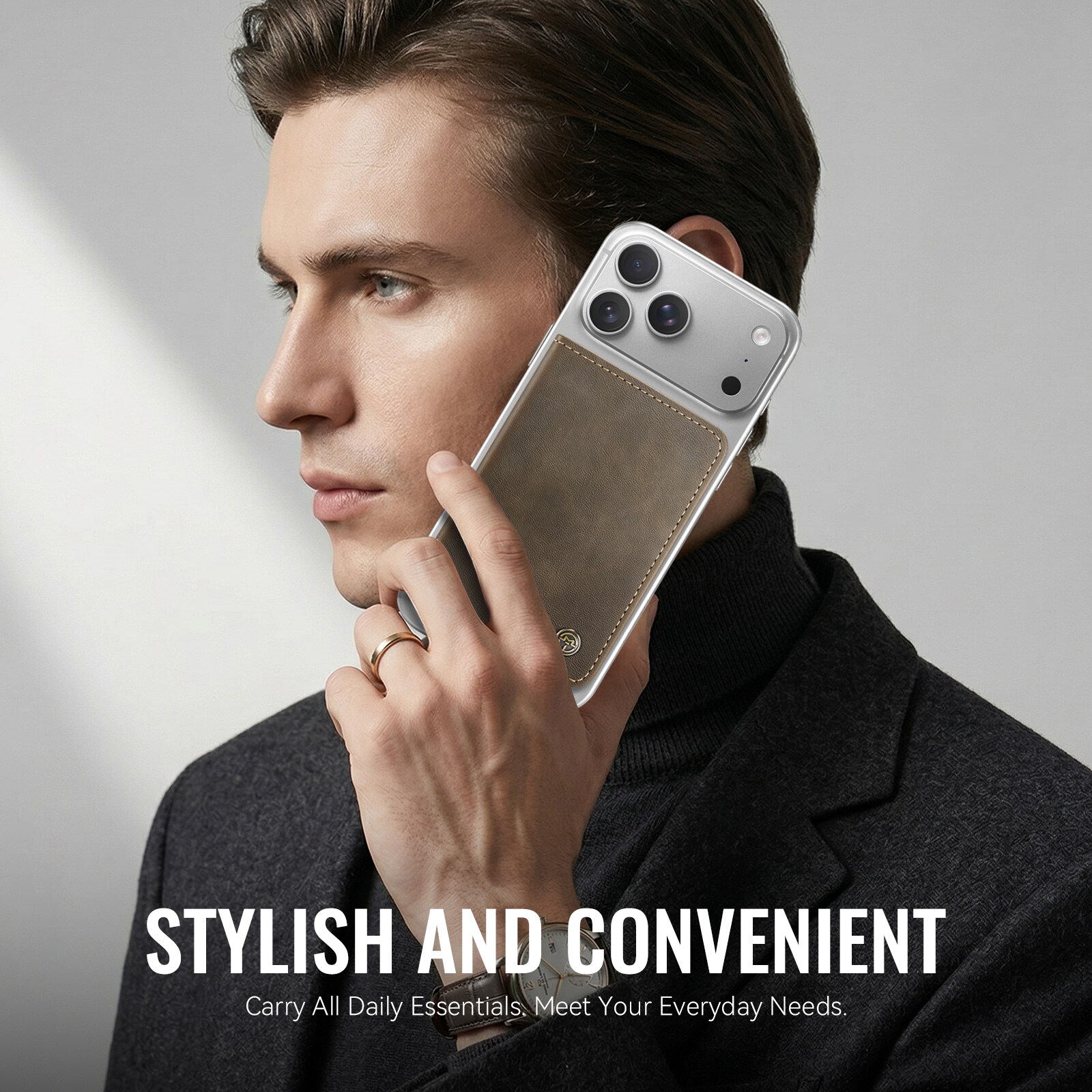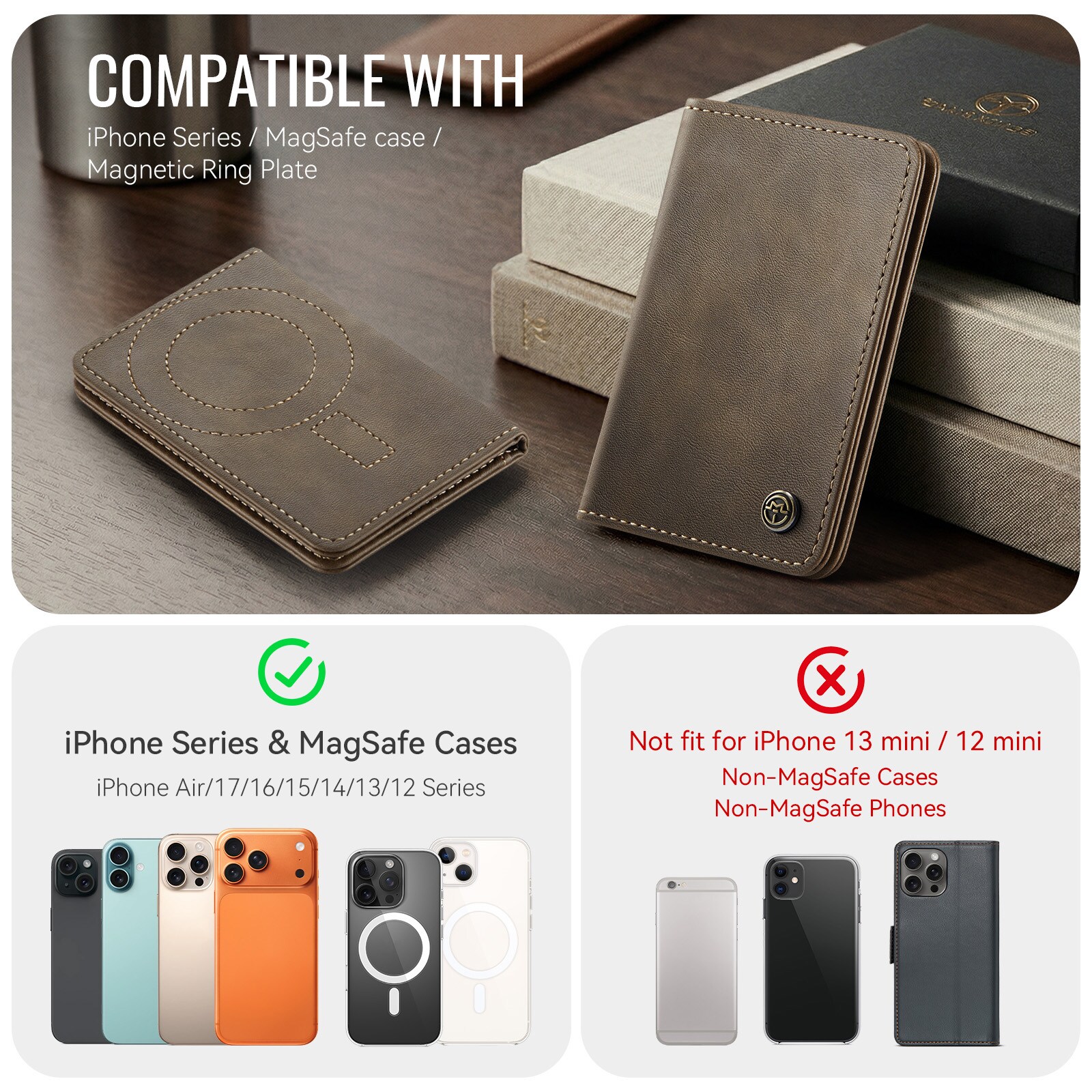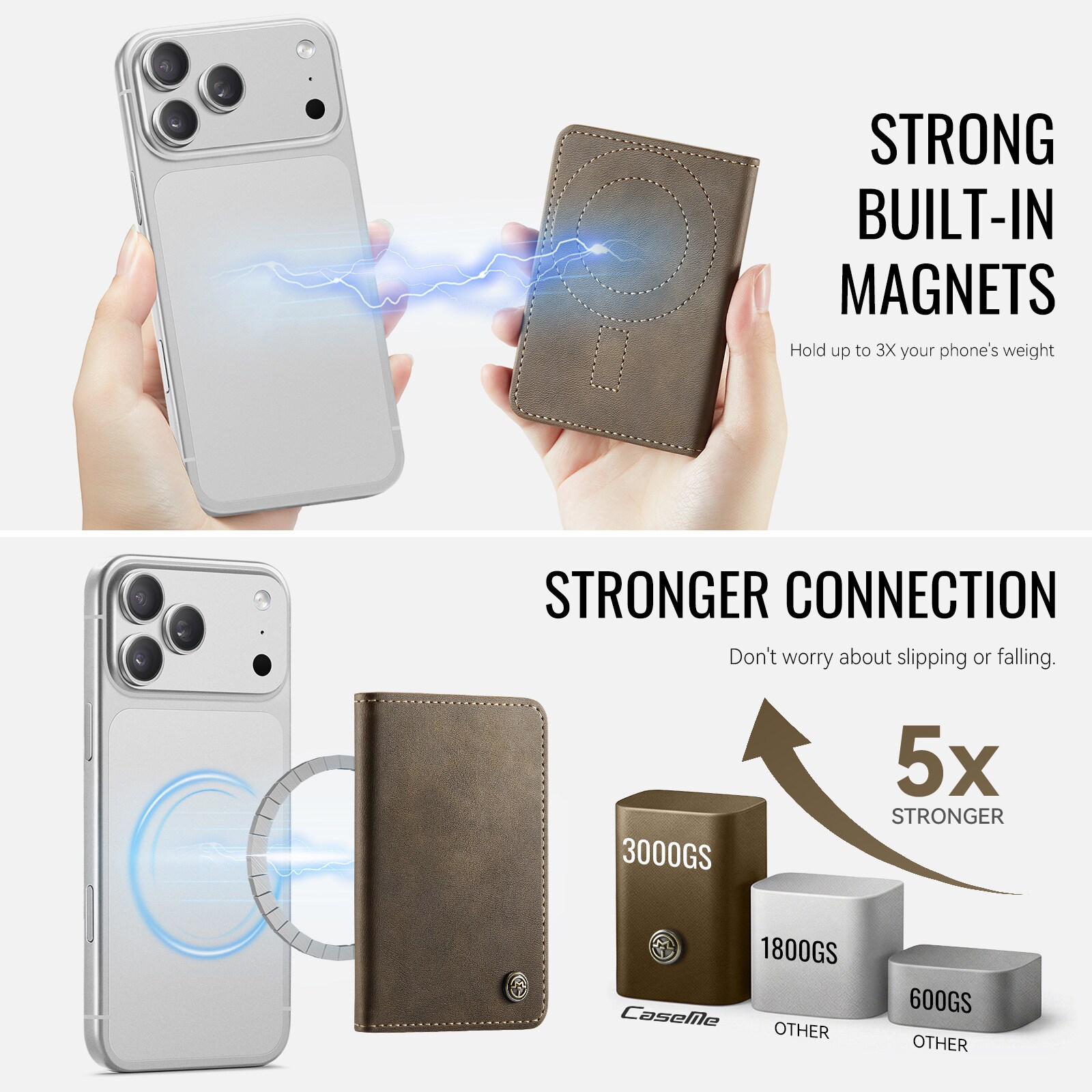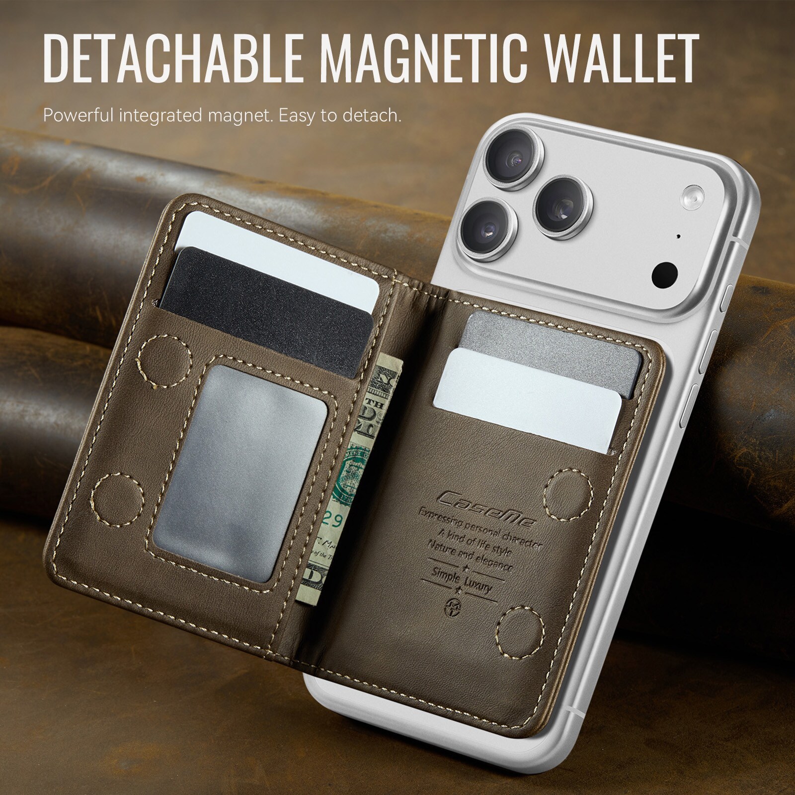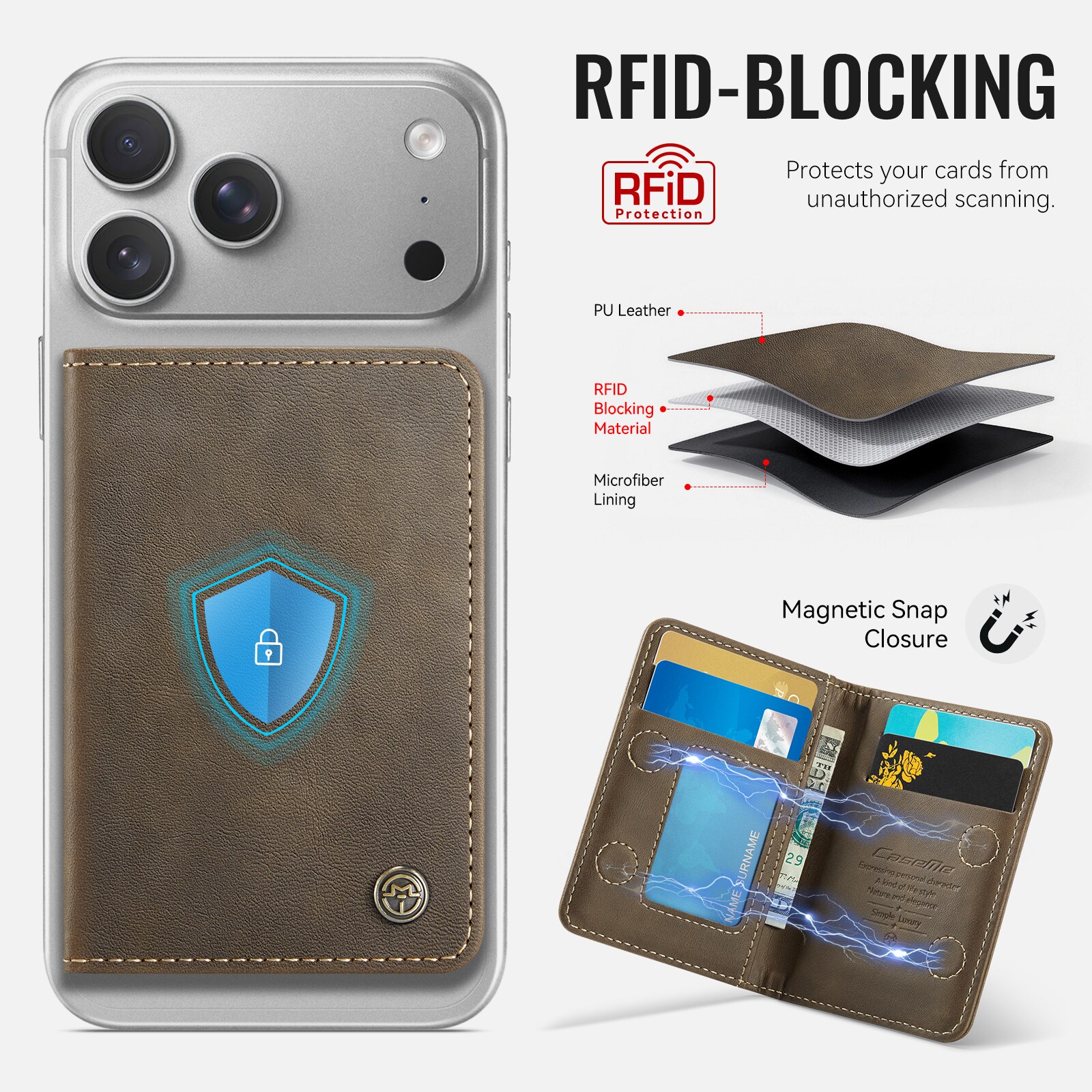 MagSafe Leder Geldbörse mit schlankem Design und praktischer Ständerfunktion von CaseMe. Dieser stilvolle und kompakte Kartenhalter bietet Platz für bis zu 4 Karten sowie Bargeld und dient gleichzeitig als praktischer Handyhalter für die freihändige Nutzung. Perfekt zum Ansehen von Videos, für Anrufe oder zum Surfen ohne das Smartphone in der Hand zu halten. Mit integriertem RFID-Schutz sind deine Karten und persönlichen Daten vor unbefugtem Scannen geschützt.